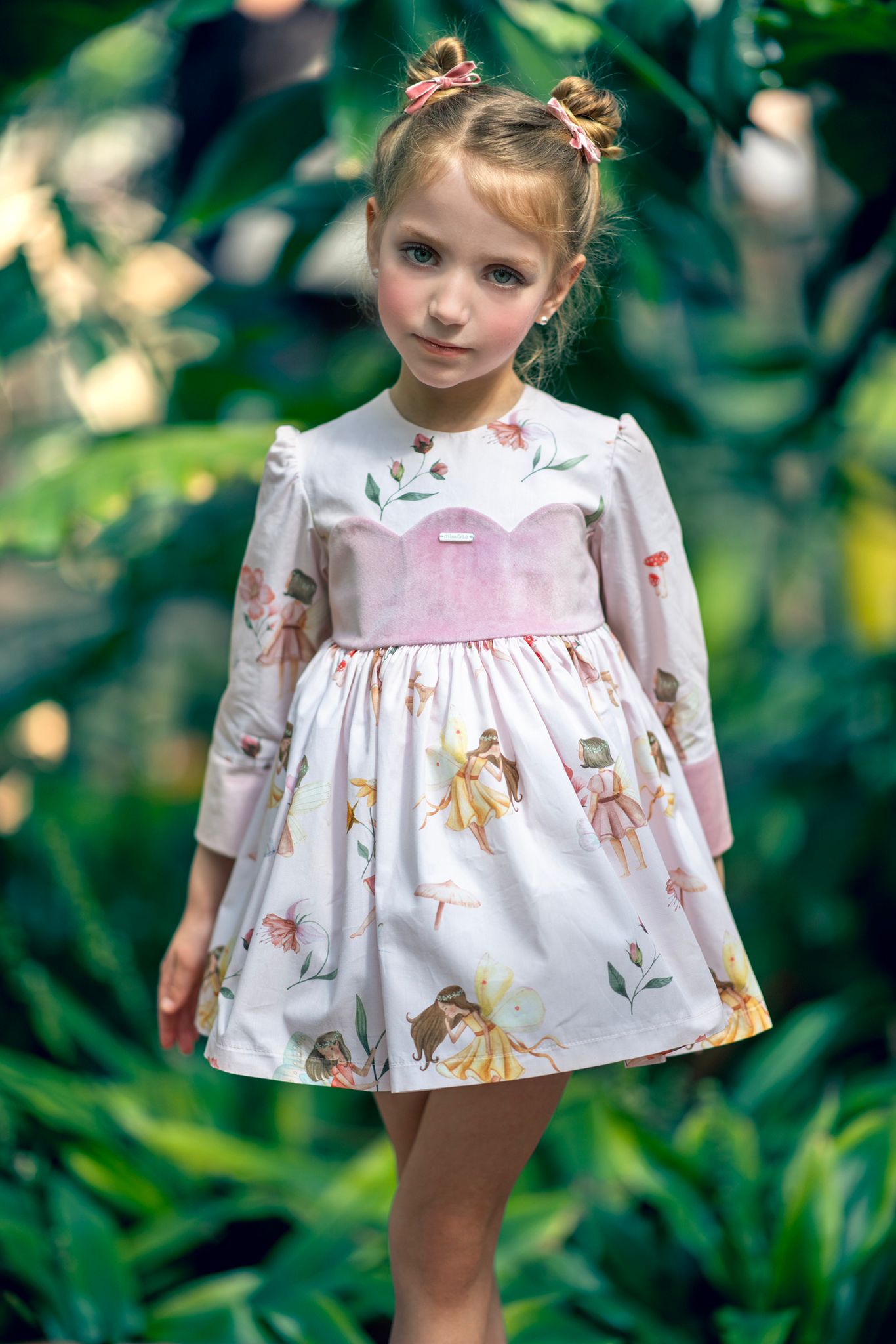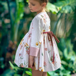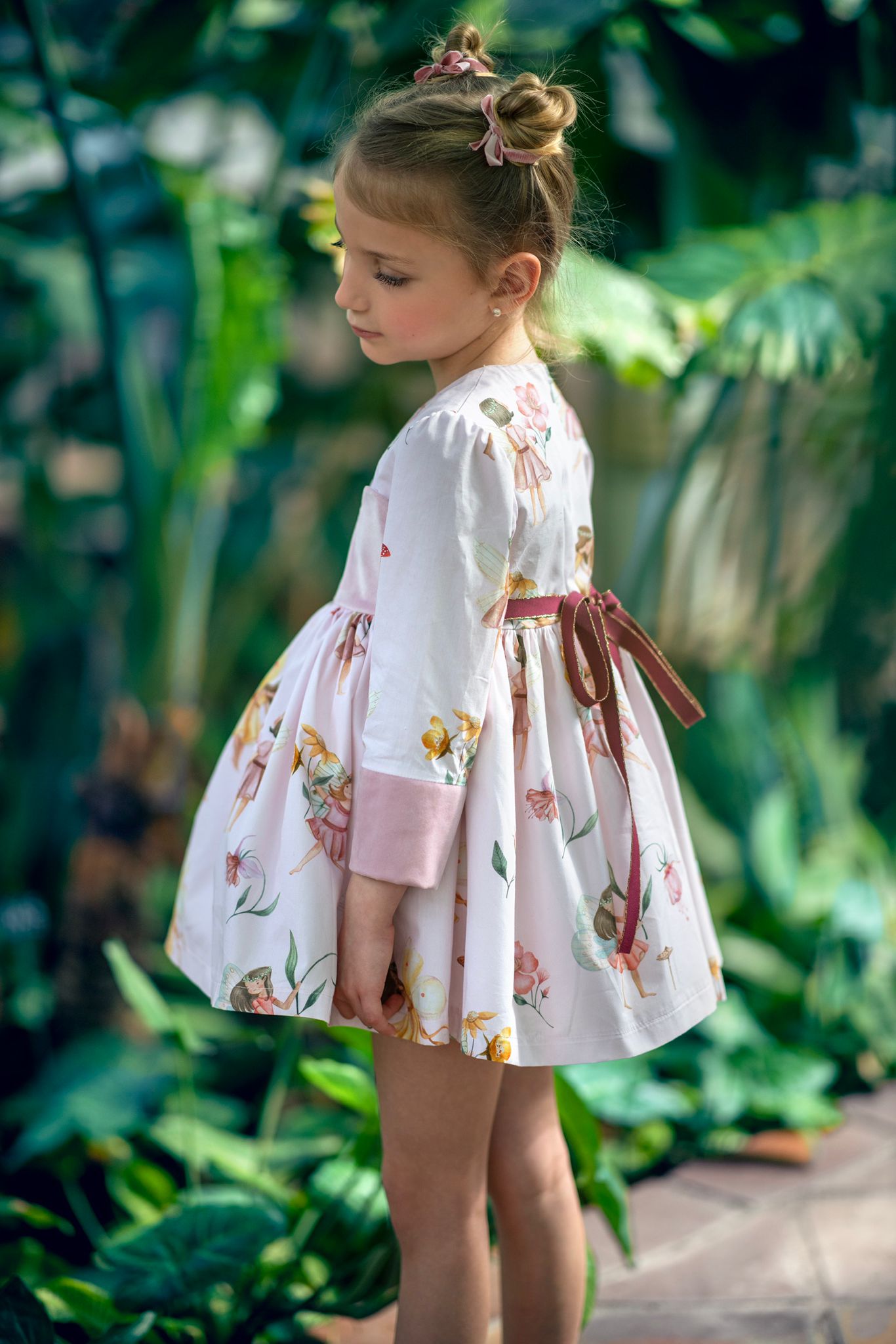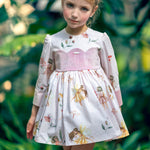 Abito dallo stile romantico in caldo cotone manica lunga con stampa di fatine e dettagli in velluto rosa antico sul corpetto e sulle maniche ,sul retro nastro in contrasto bordeaux con possibilità di fare il fiocco .