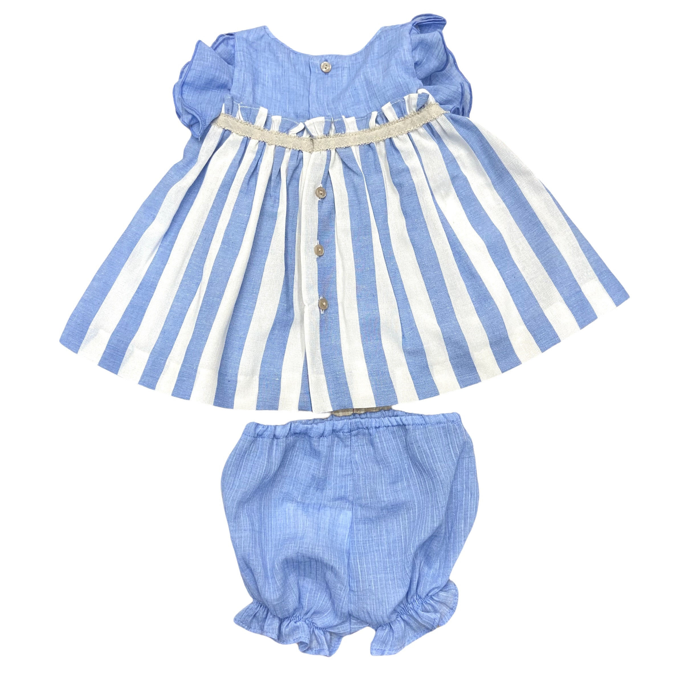 Half sleeve dress with sleeves embellished with light blue ruffles. On the waist there is a ruches with light blue and white striped pattern and a small beige belt.