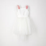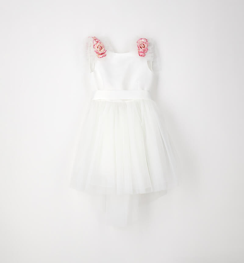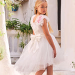 Abito elegante per ragazza Sarabanda con corpetto e fusciacca in raso opaco e gonna in tulle. Modello foderato con apertura dietro tramite zip invisibile. Applicazione di fiori staccabili. Davanti la lunghezza è sopra al ginocchio, mentre dietro a metà polpaccio. L'abito fa parte della collezione Sarabanda Premium pensata per vestire le cerimonie più formali