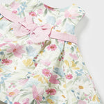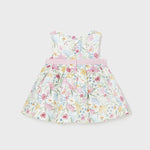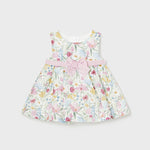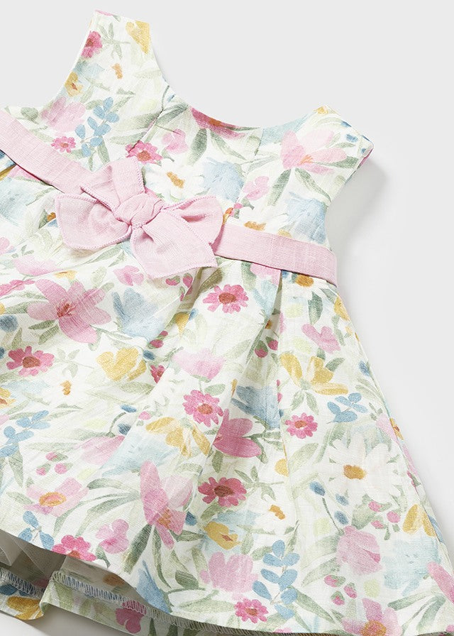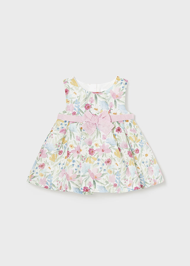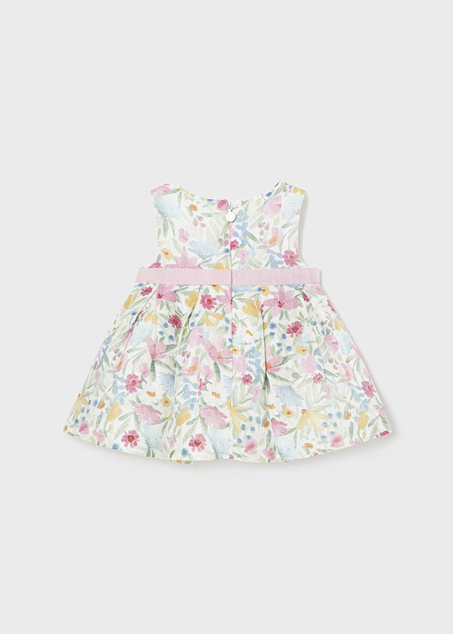 Vestito senza manica per neonata. Girocollo. Chiusura con cerniera nella parte posteriore per un vestibilità rapida e comoda. Tessuto dall'aspetto fresco e moderno di lino. Elegante fusciacca in vita. Design stampato.