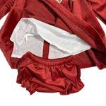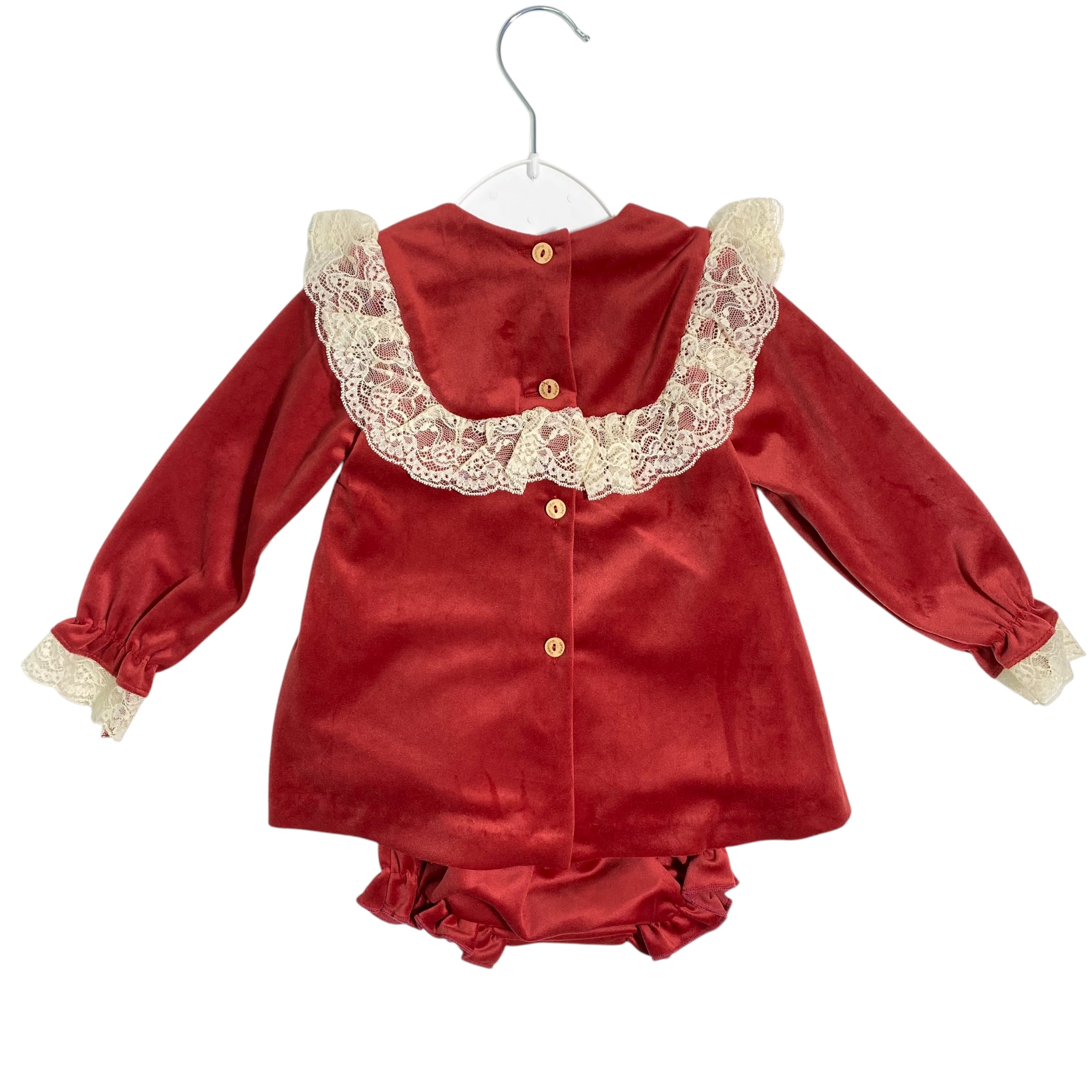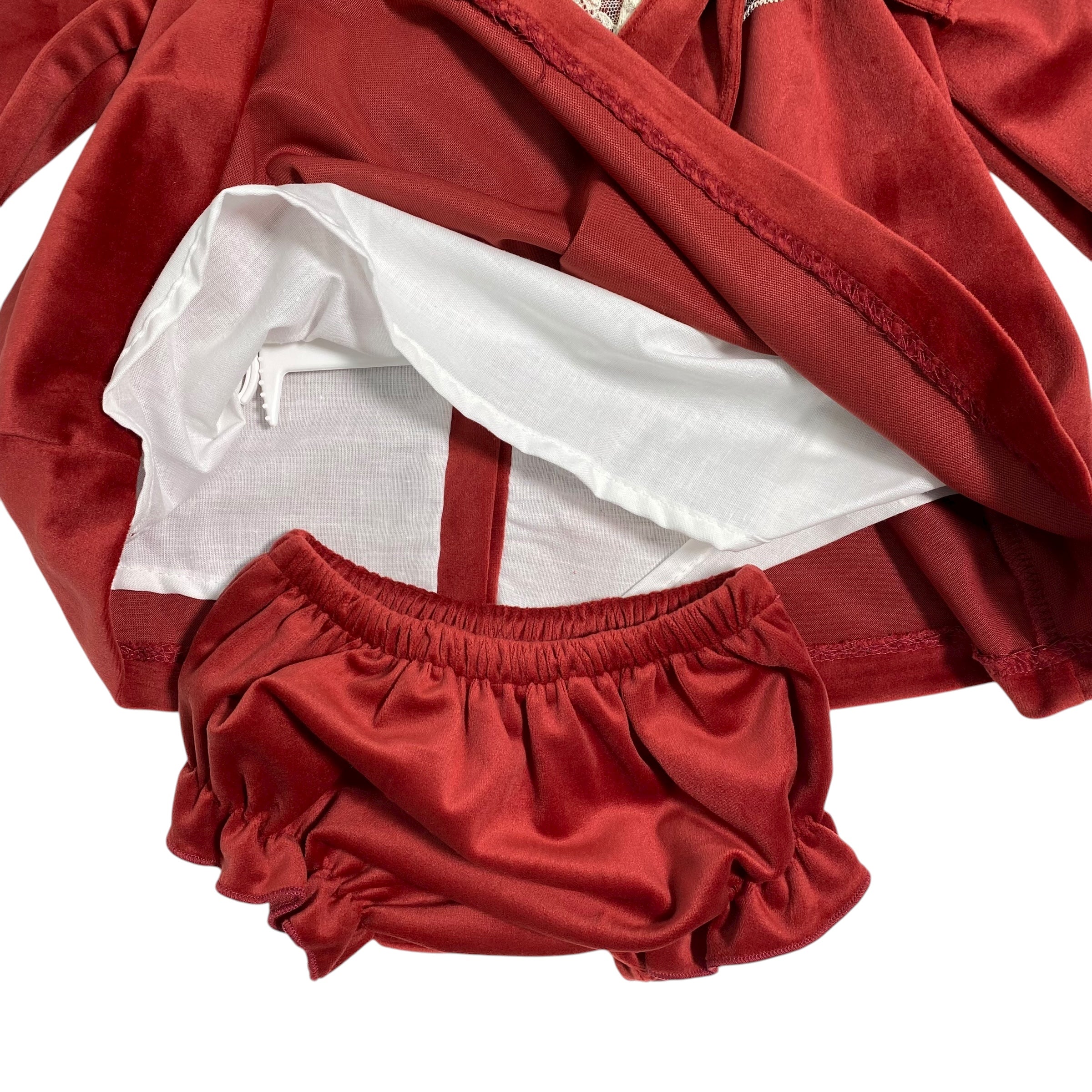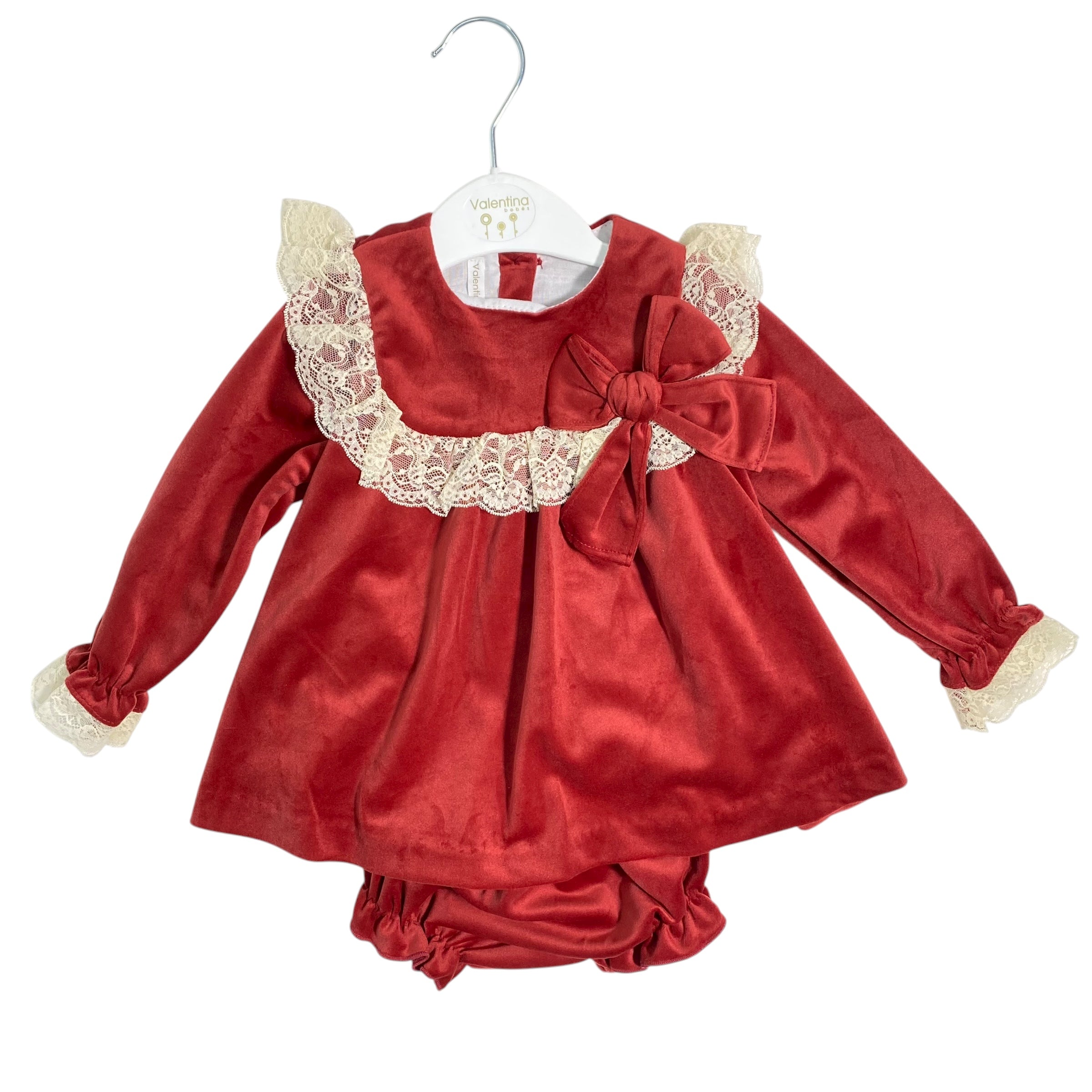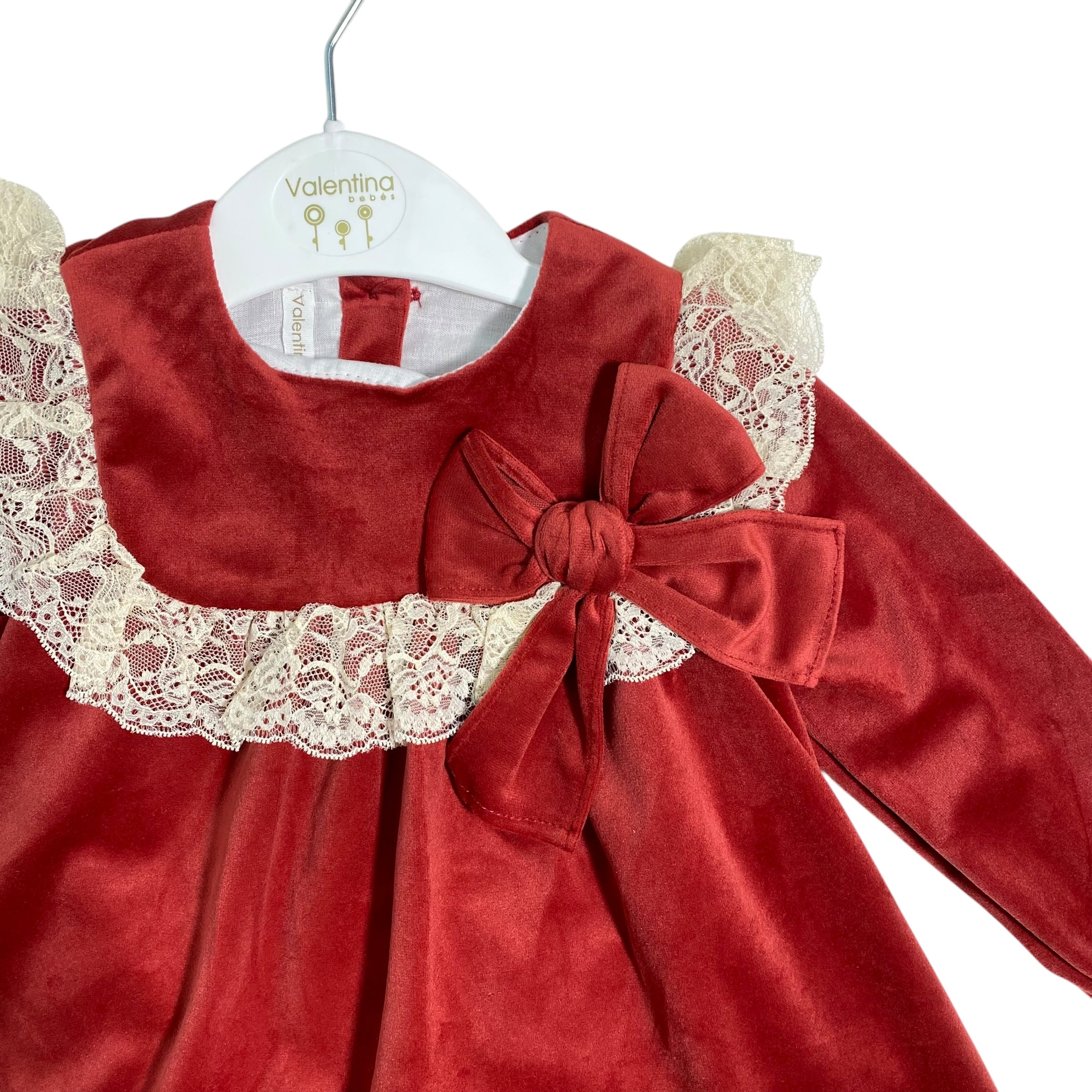 Abito elegante in velluto per bambina con maniche lunghe svasate, impreziosito da un delicato fiocco e applicazione di pizzo raffinato. La culotte coordinata assicura comfort e praticità. Perfetto per le occasioni festive natalizie, questo capo combina lusso e dolcezza, ideale per valorizzare i momenti speciali della piccola con stile sofisticato e ricercato.