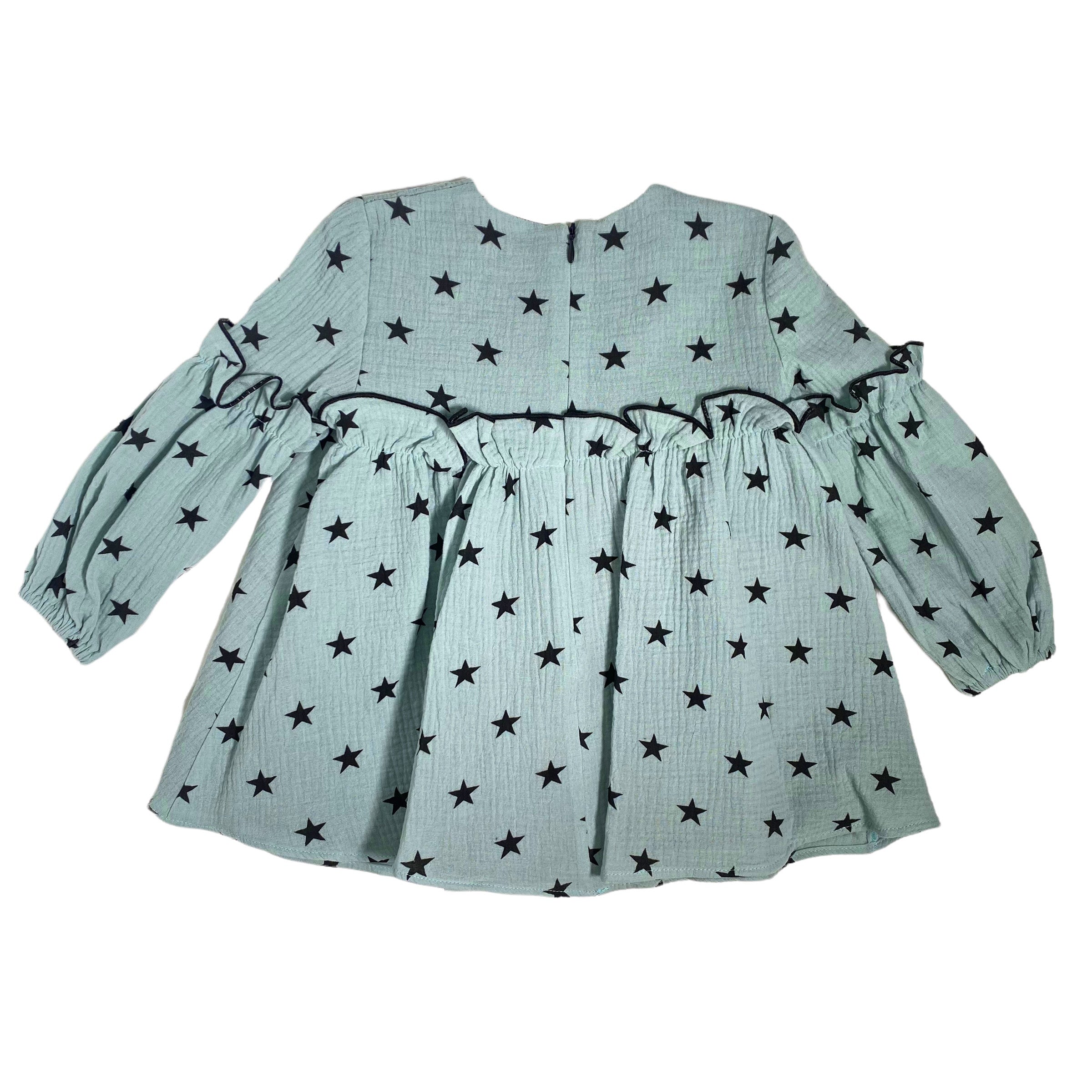 Long-sleeved flared dress in warm cotton, in solid green color, with black stars.