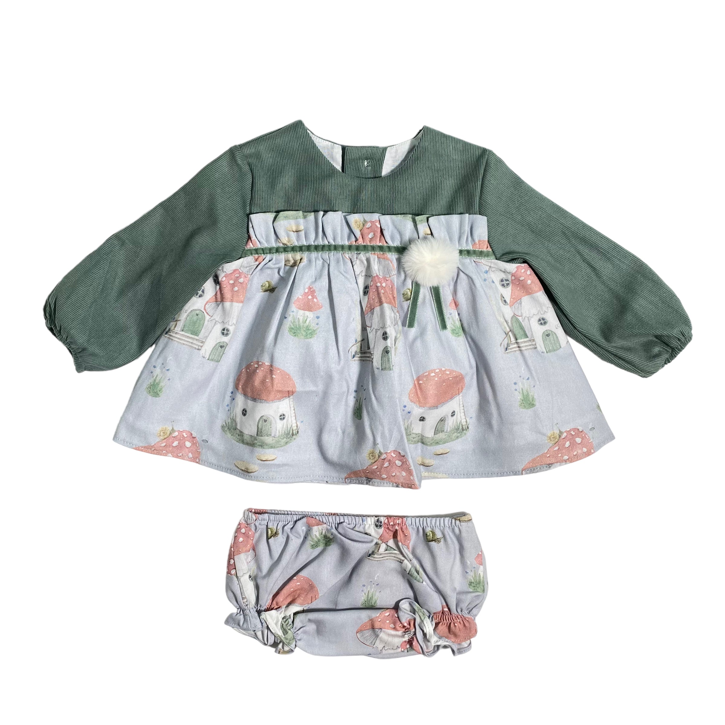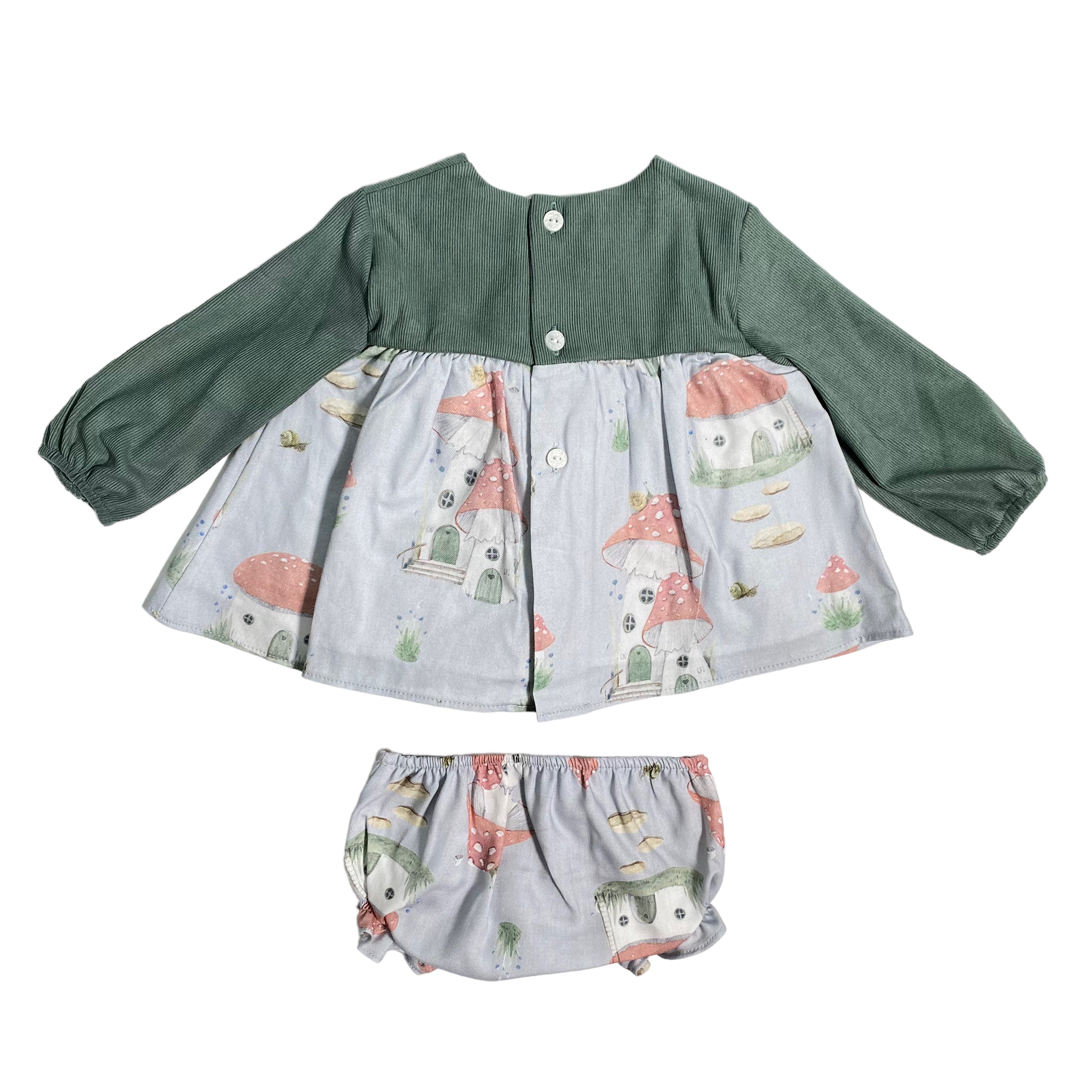 Abito svasato con corpetto in velluto millerighe verde e parte sottostante in tessuto in caldo cotone stampato.