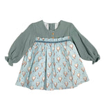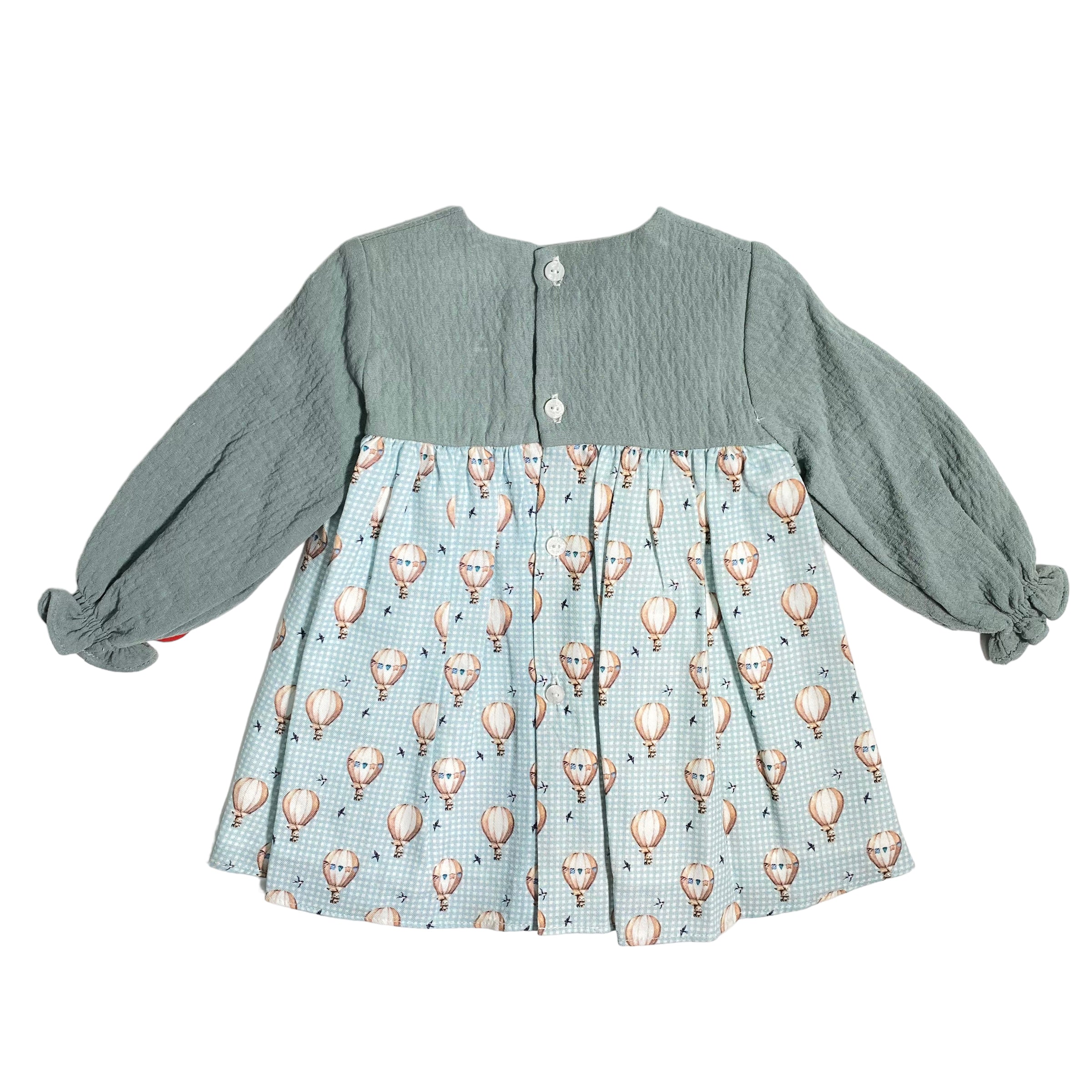 Abito svasato manica lunga in caldo cotone, fantasia mongolfiere.