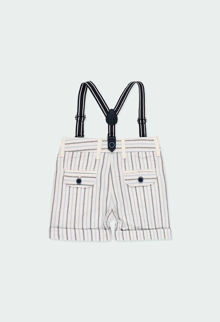 The waist is adjusted with internal elastic with eyelets and a button on both sides. The shoulder straps are navy blue. The pockets are functional