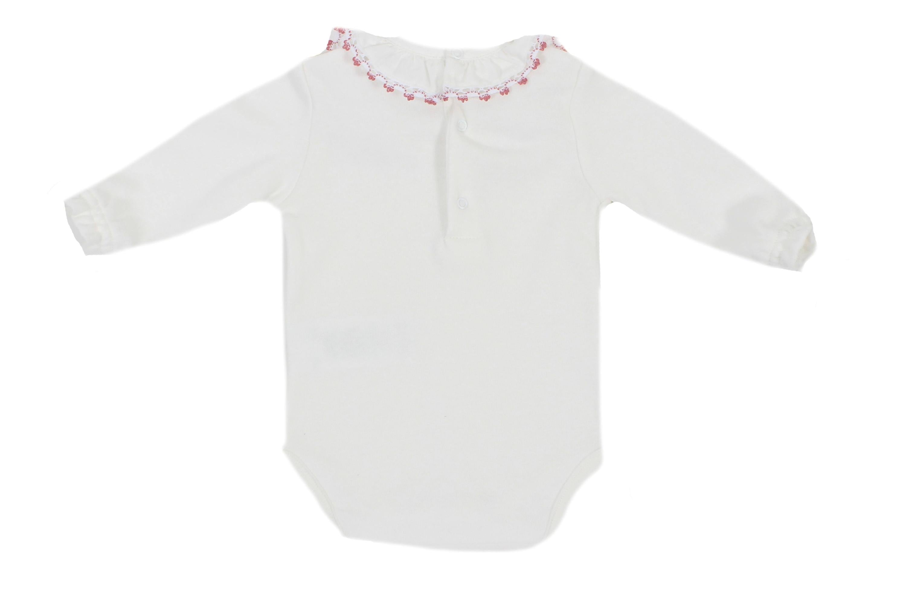 Long-sleeved bodysuit with steering wheel at the round neck with closure at the crotch and on the back with press buttons.