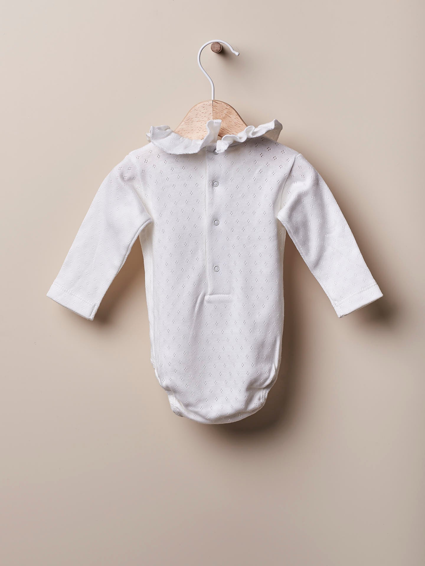 Body semplice in cotone leggero, ideale per neonati e bambine, fino a 24 mesi. Il body a maniche lunghe con colletto a balze è lavorato a maglia, si chiude dietro e tra le gambe con bottoni automatici.