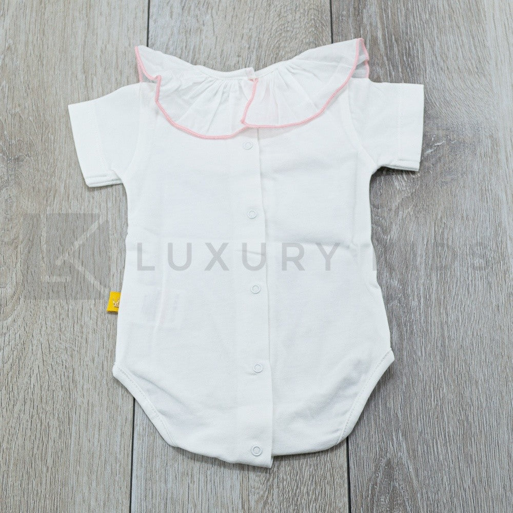 White cotton bodysuit with ruffle collar.