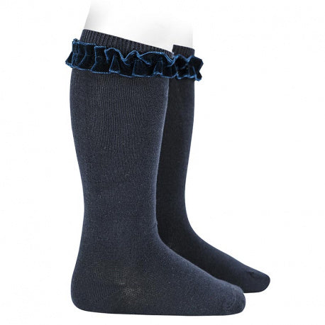Calze lunghe in caldo cotone a maglia rasata con nastro in velluto all'orlo.