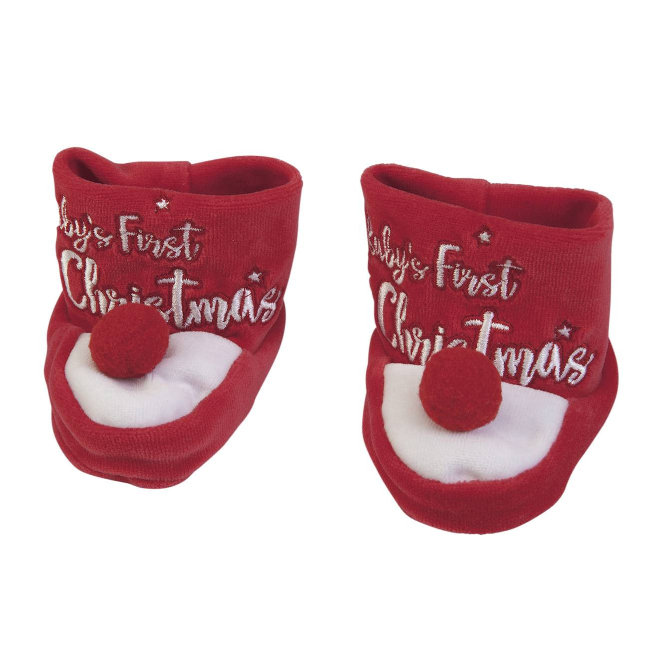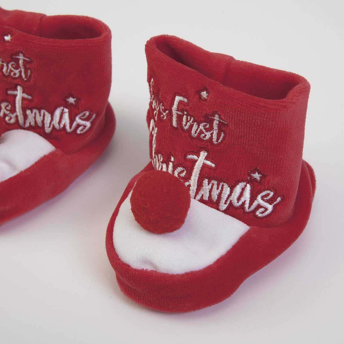 Red chenille slippers for Christmas with pompom and embroidered writing.
