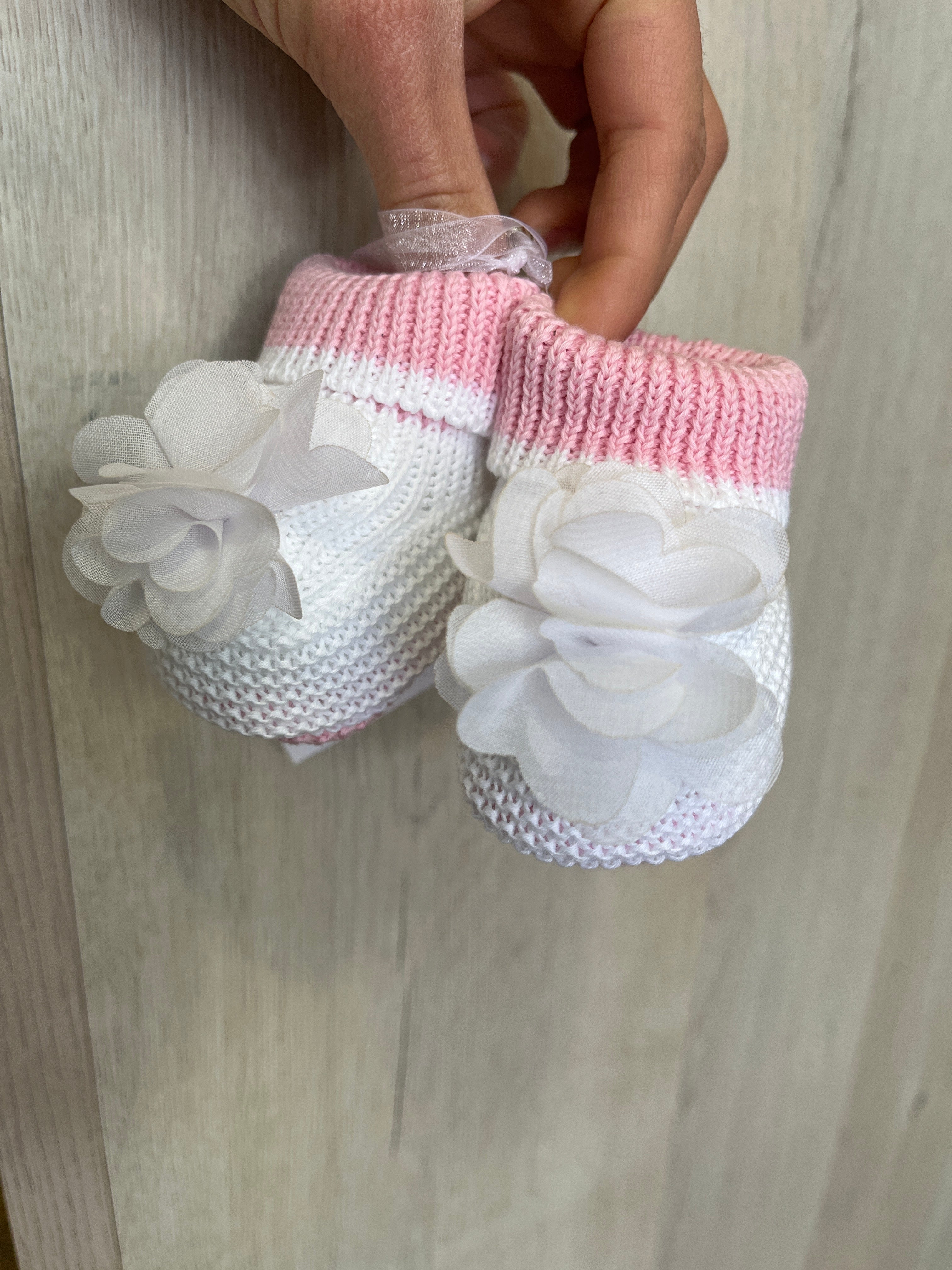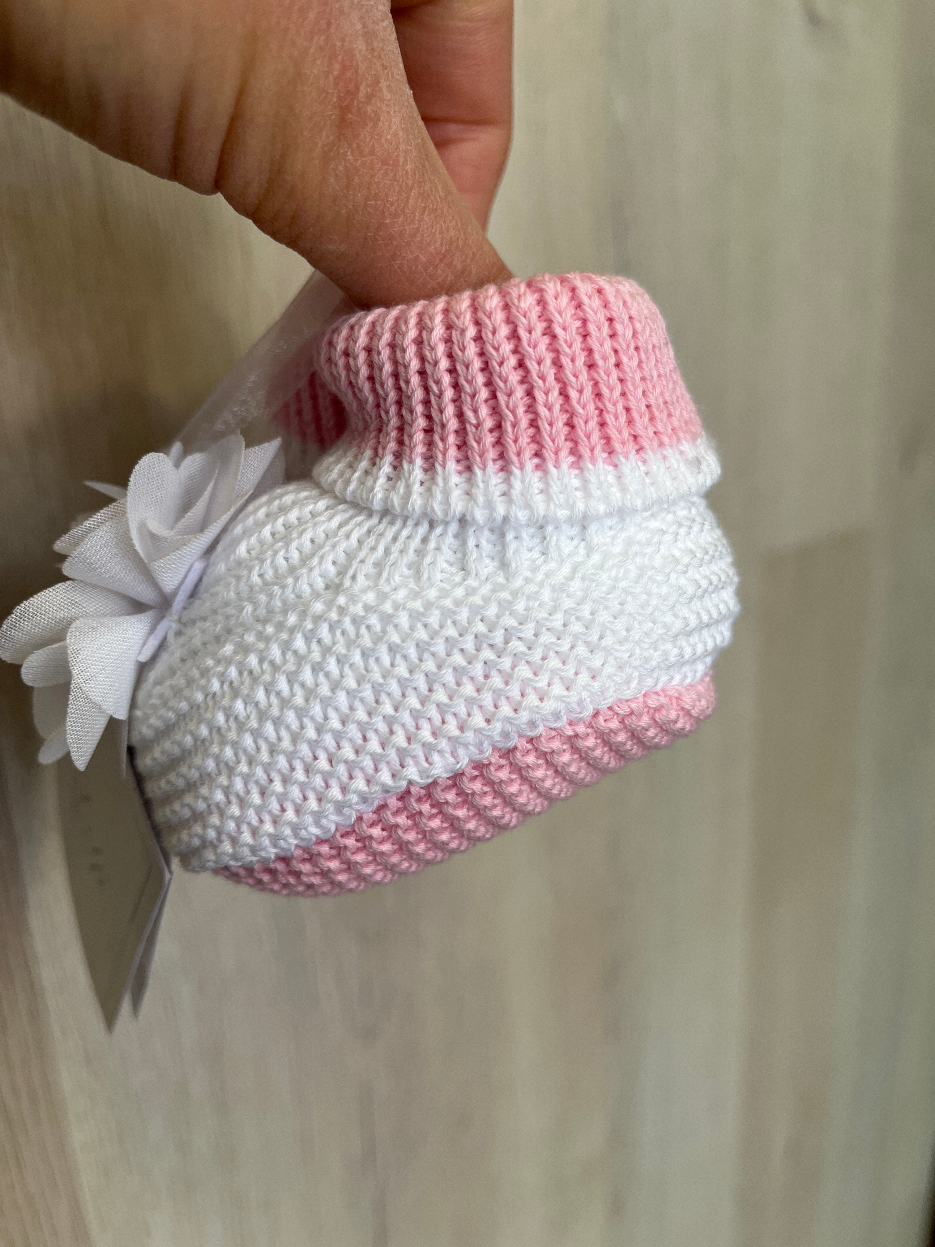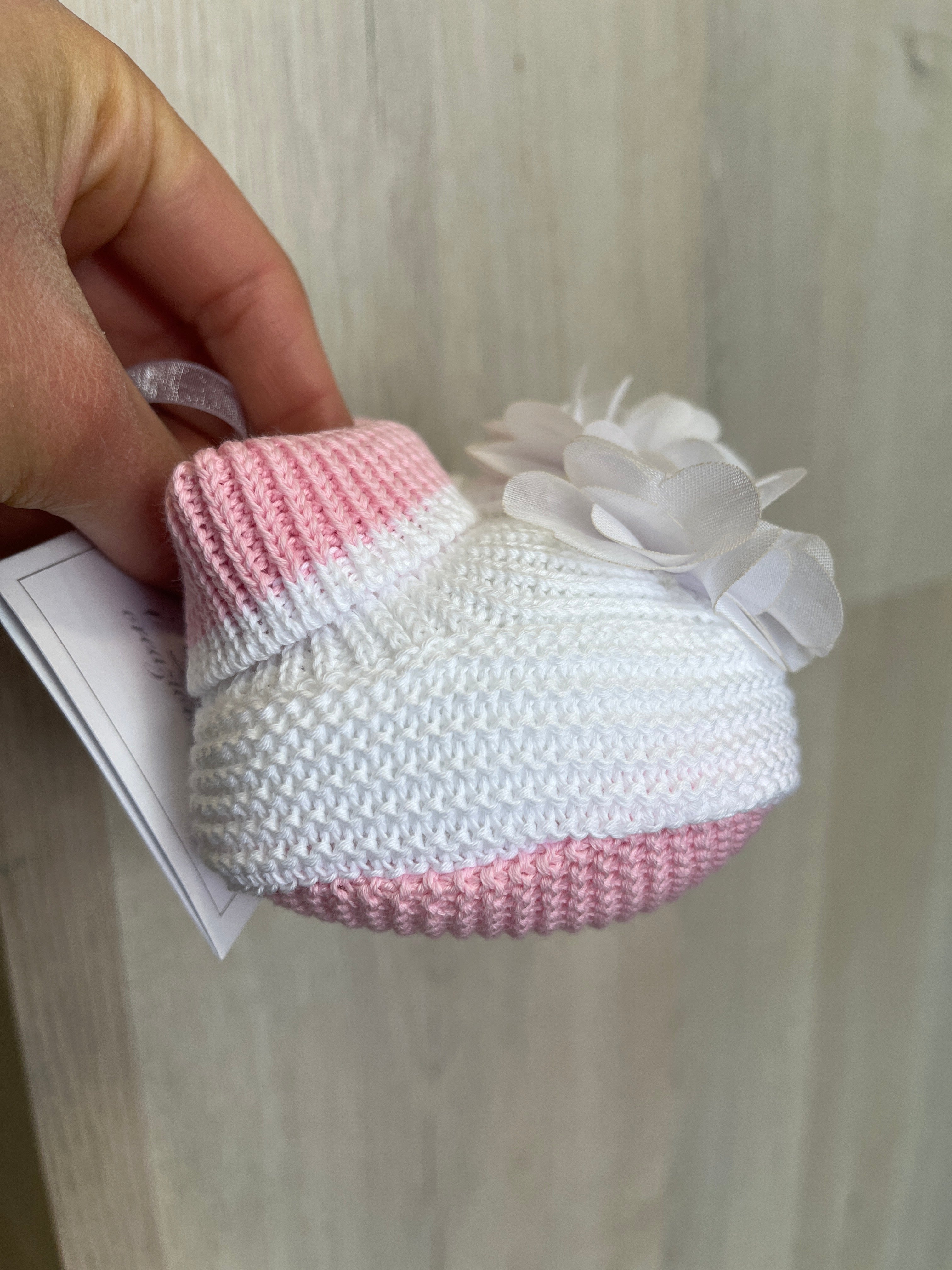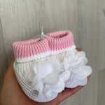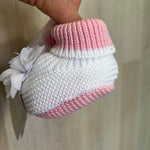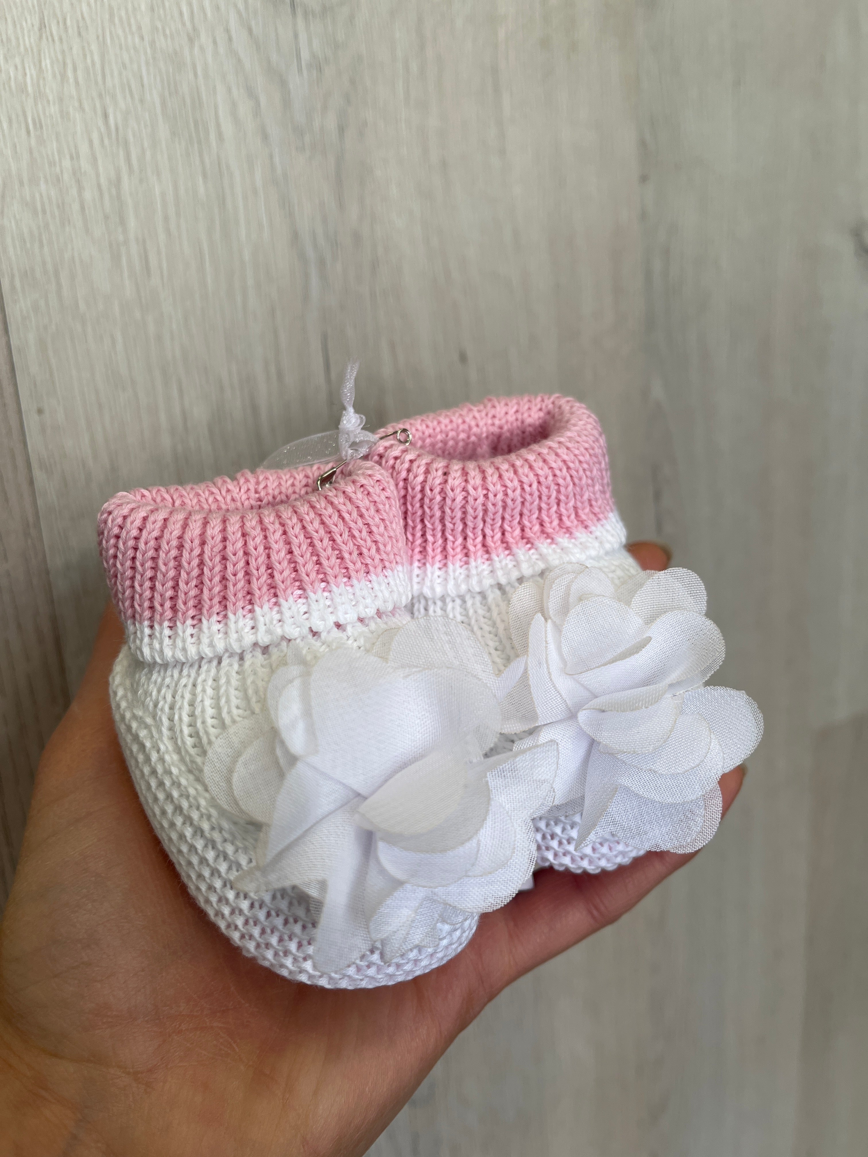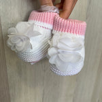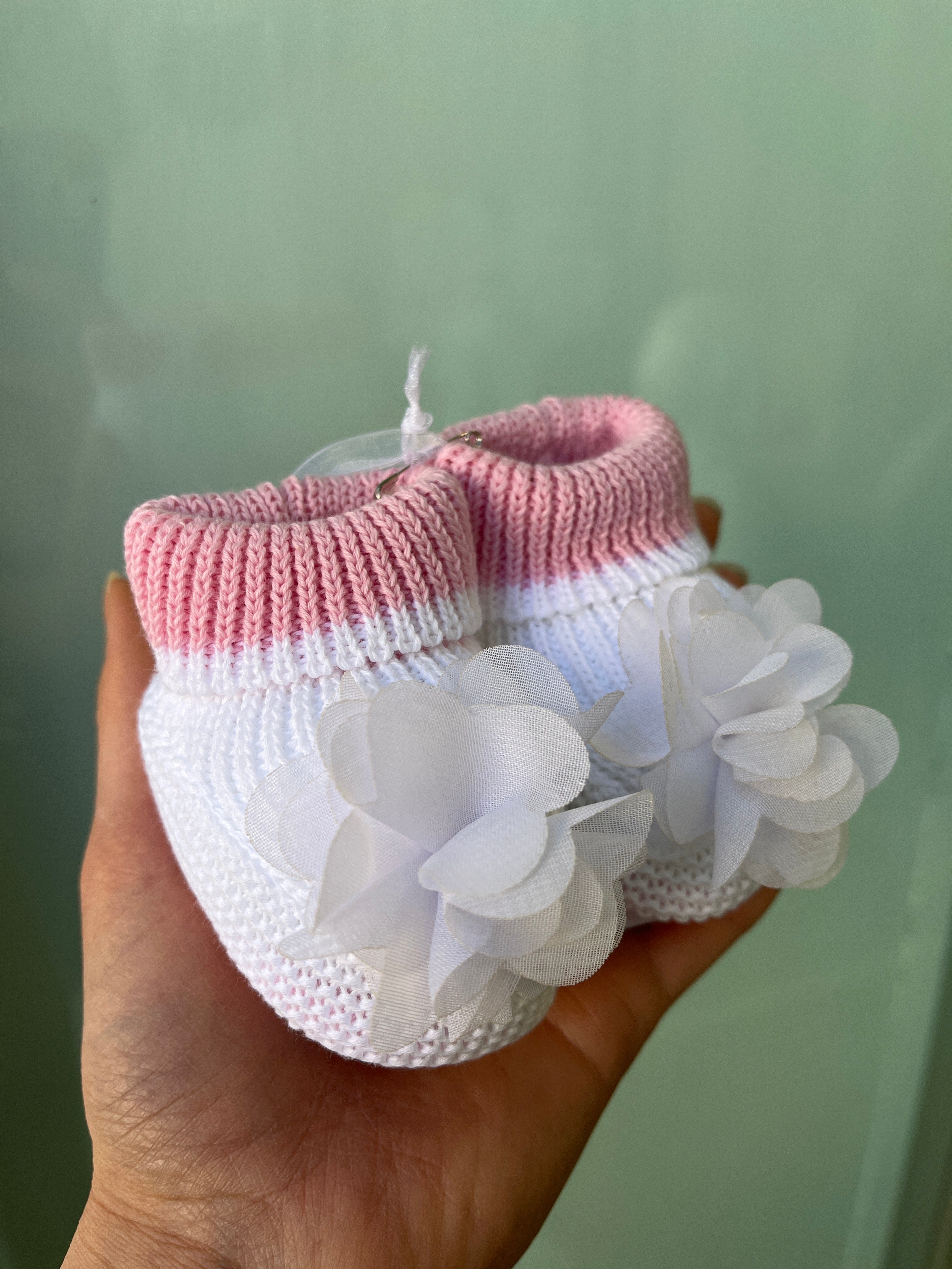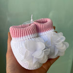 Calzino scarpetta in filo di cotone, rosa e bianche, con petali sul davanti.
