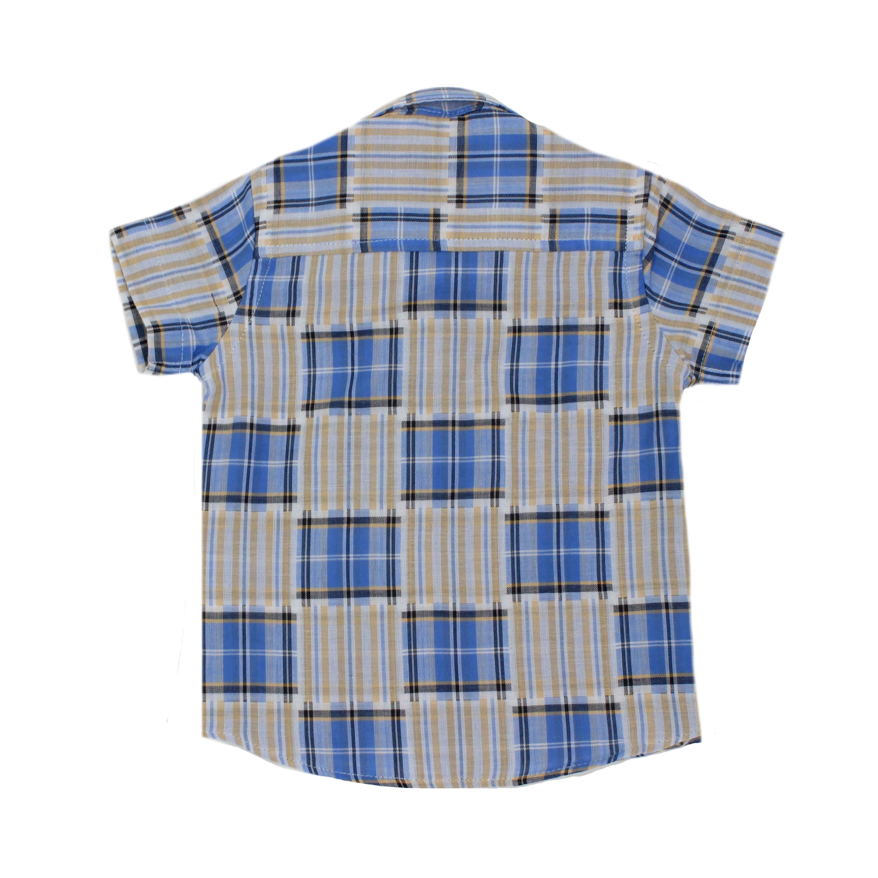Half Sleeve Cotton Shirt. Mustard, Light Blue and Cream Squares Pattern