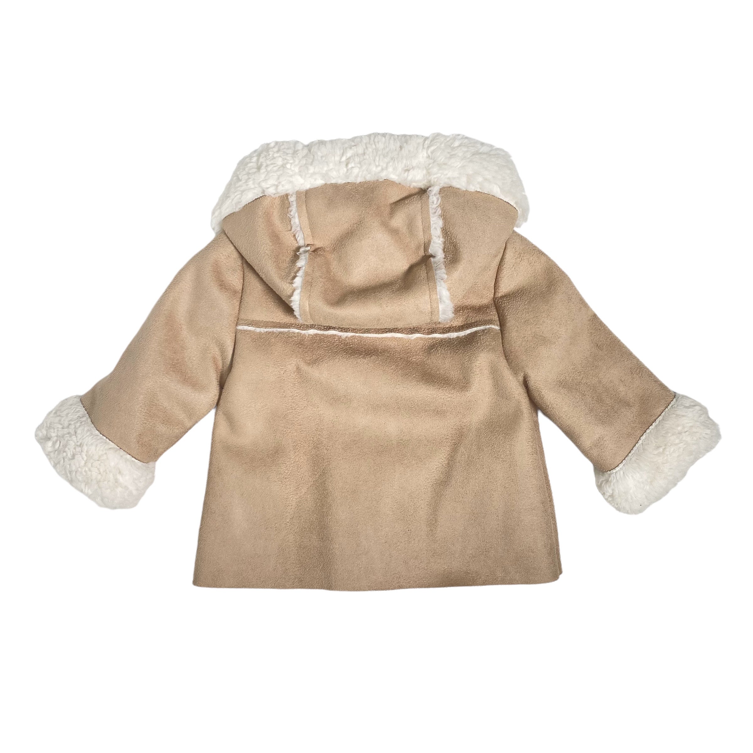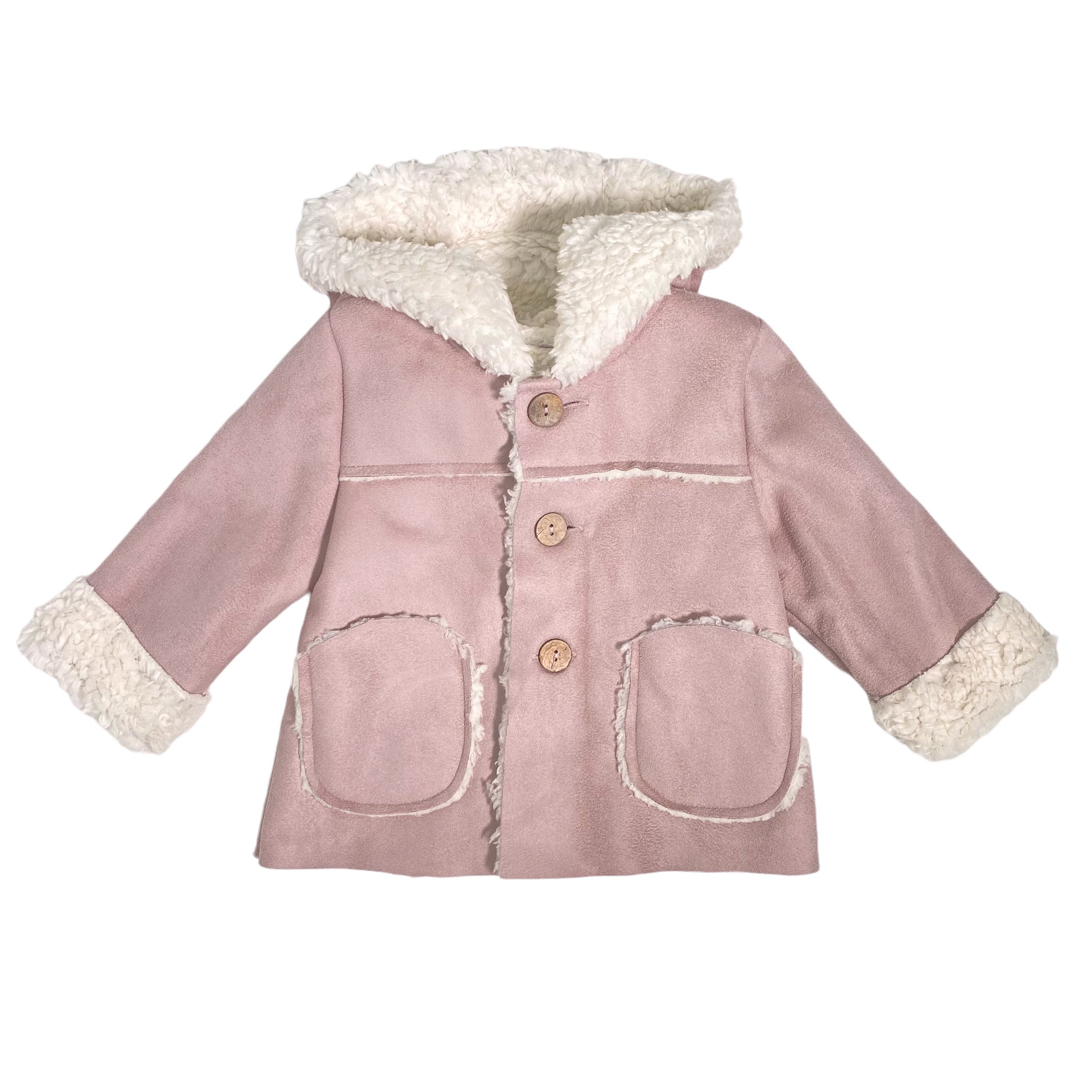 Sheepskin coat in faux fur with hood, pockets on the front and closure with wooden buttons.
