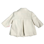 Cappottino svasato in panno, con colletto tondo e chiusura con due bottoncini.