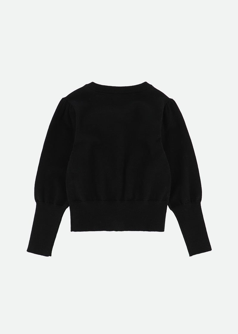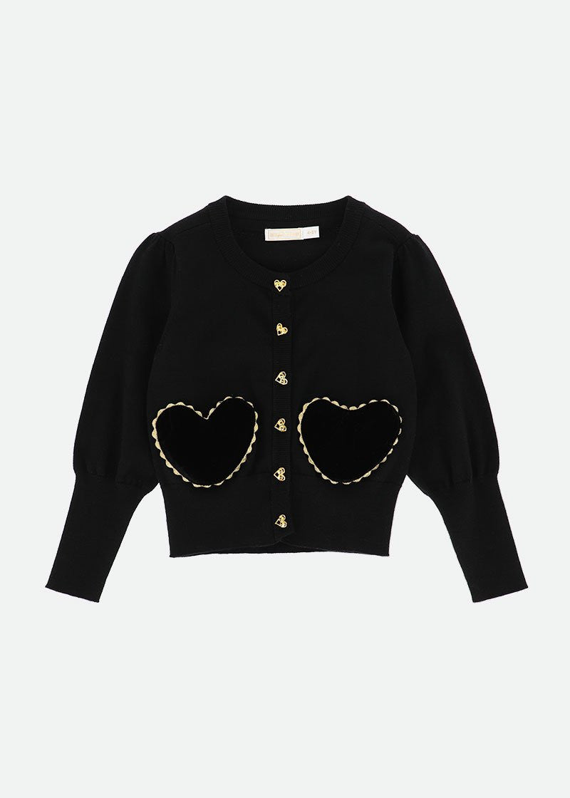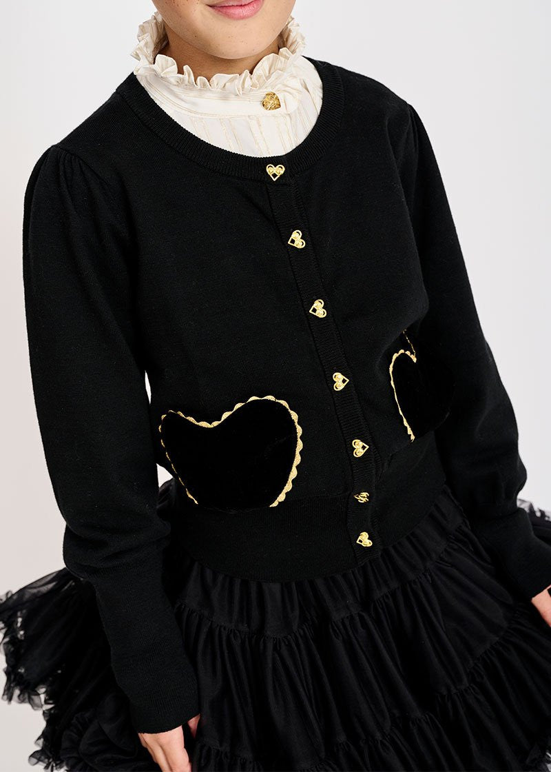 The Jemima cardigan in soft fine knitted cotton has a fitted shape with slightly puffed sleeves and long cuffs, the sleek silhouette will complement any outfit. This style is complemented by our eye-catching, vintage-inspired heart-shaped buttons and velvet pockets edged with a gold rack, which add a touch of glamor to any outfit.