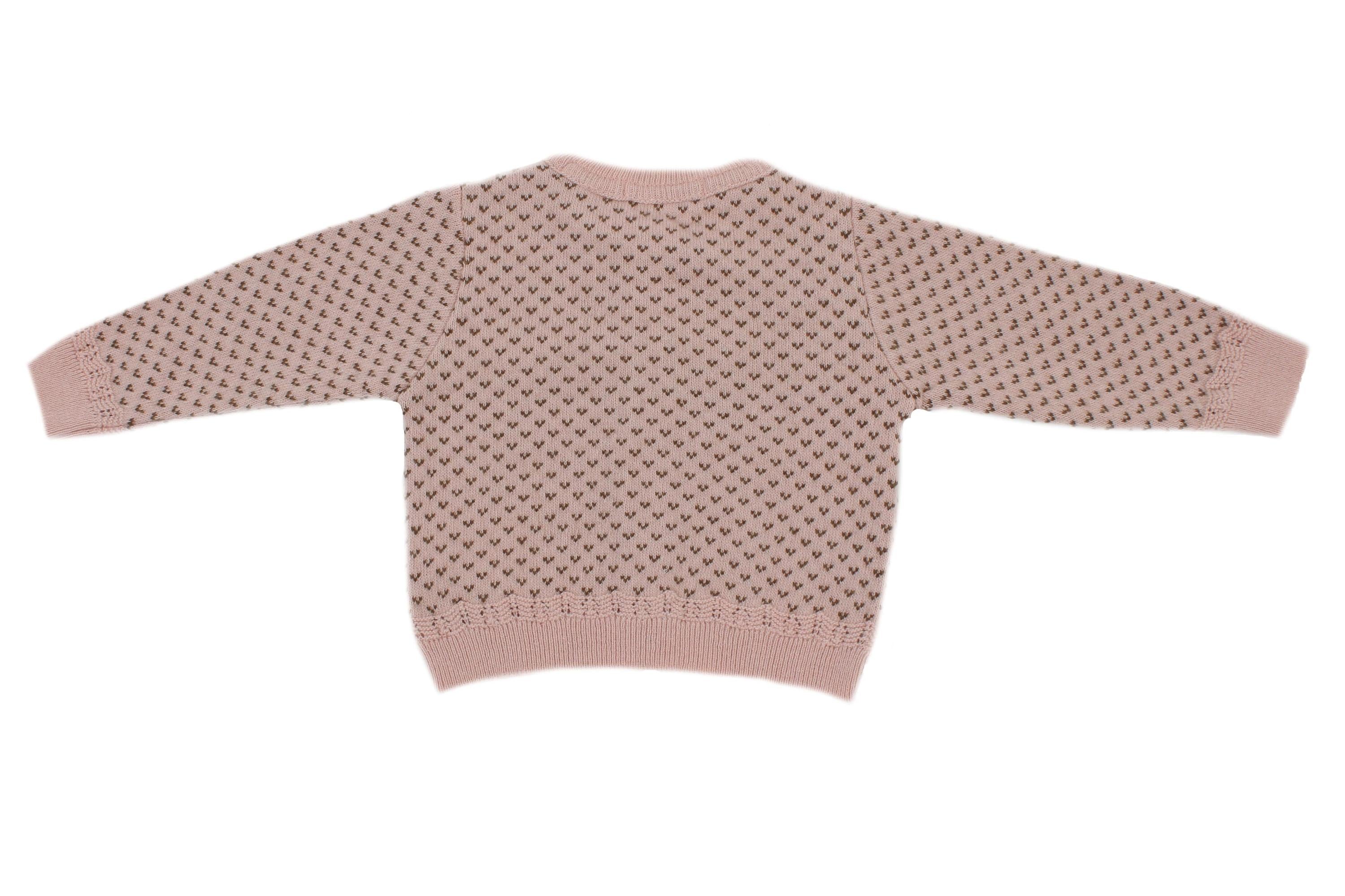 Long-sleeved crew-neck cardigan, with front closure and hearts pattern.