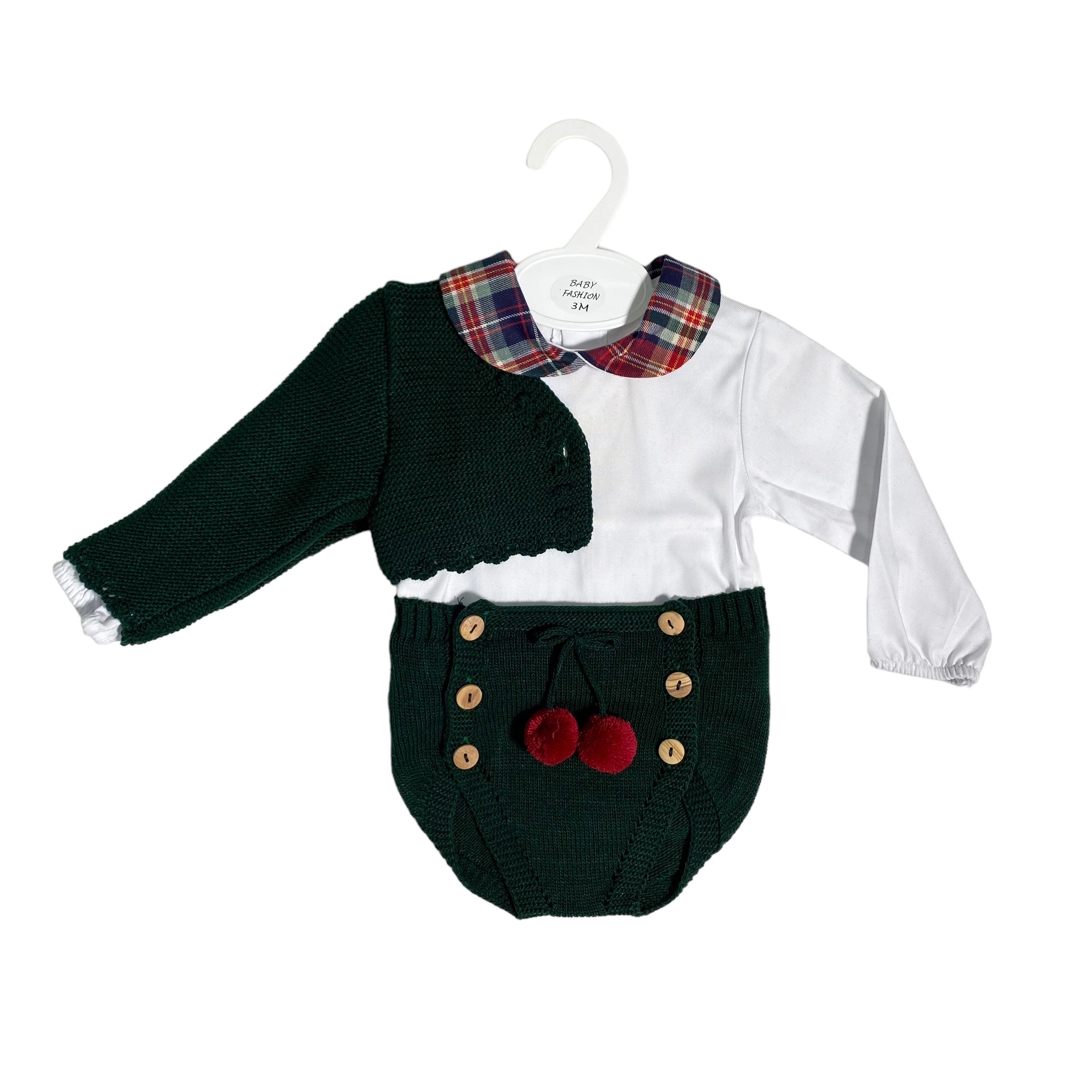 Completo composto da culotte in tessuto anallergico acrilico, camicia bianca con colletto scozzese e coprispalle corto.