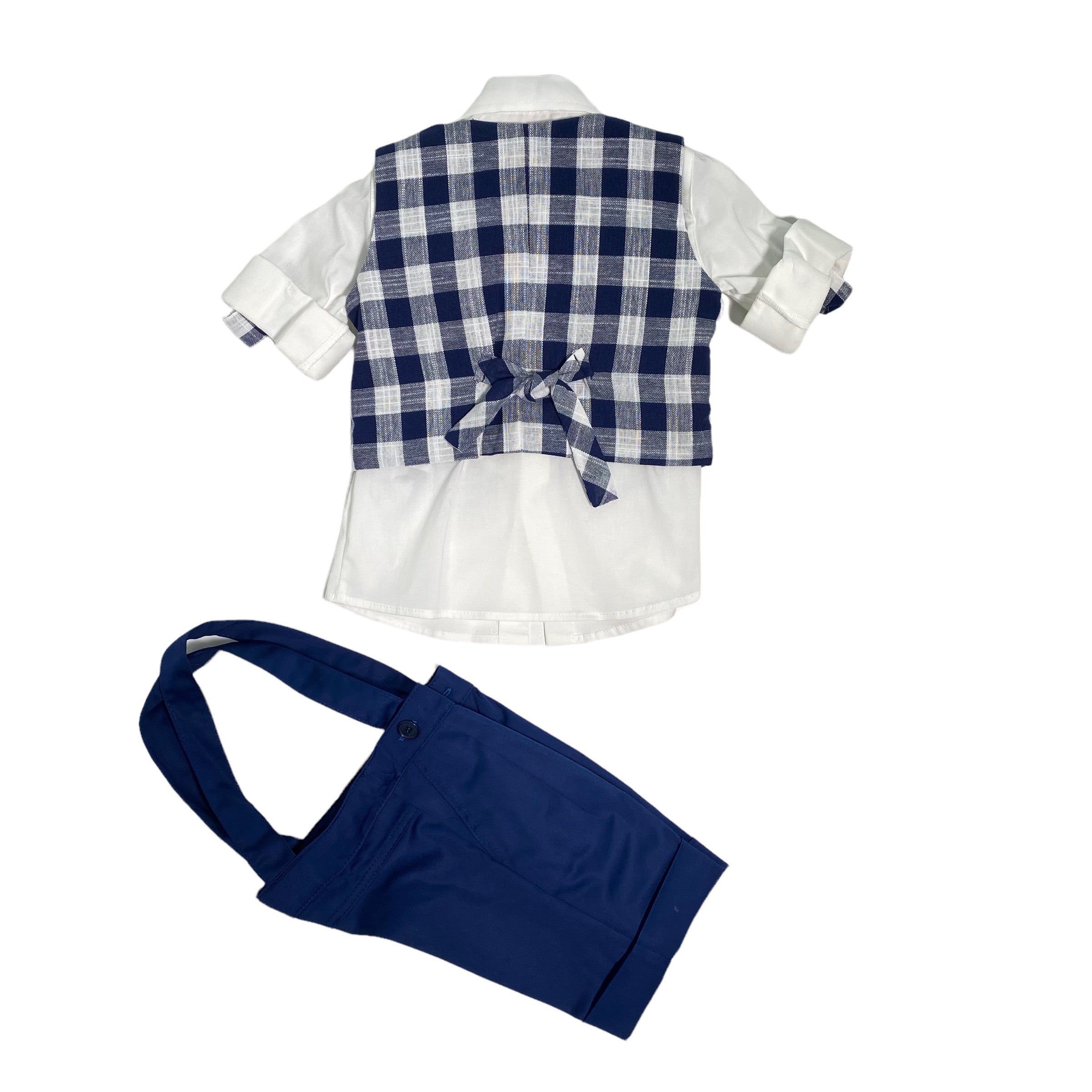 Blue and white checked cotton vest and adjustable with a bow on the back. Finished with blue satin on all edges. Blue broken shoulder straps that match the color of the trousers.