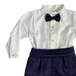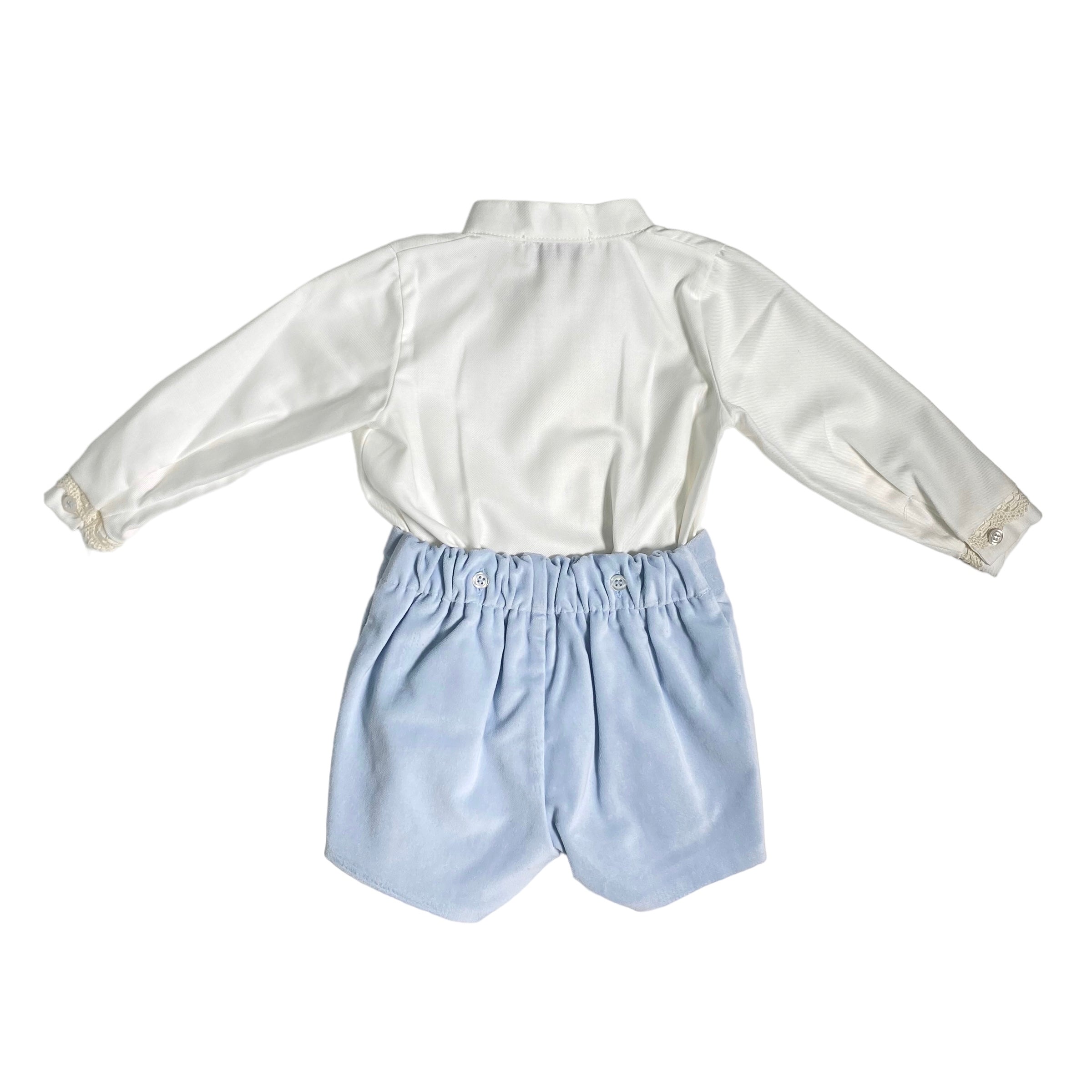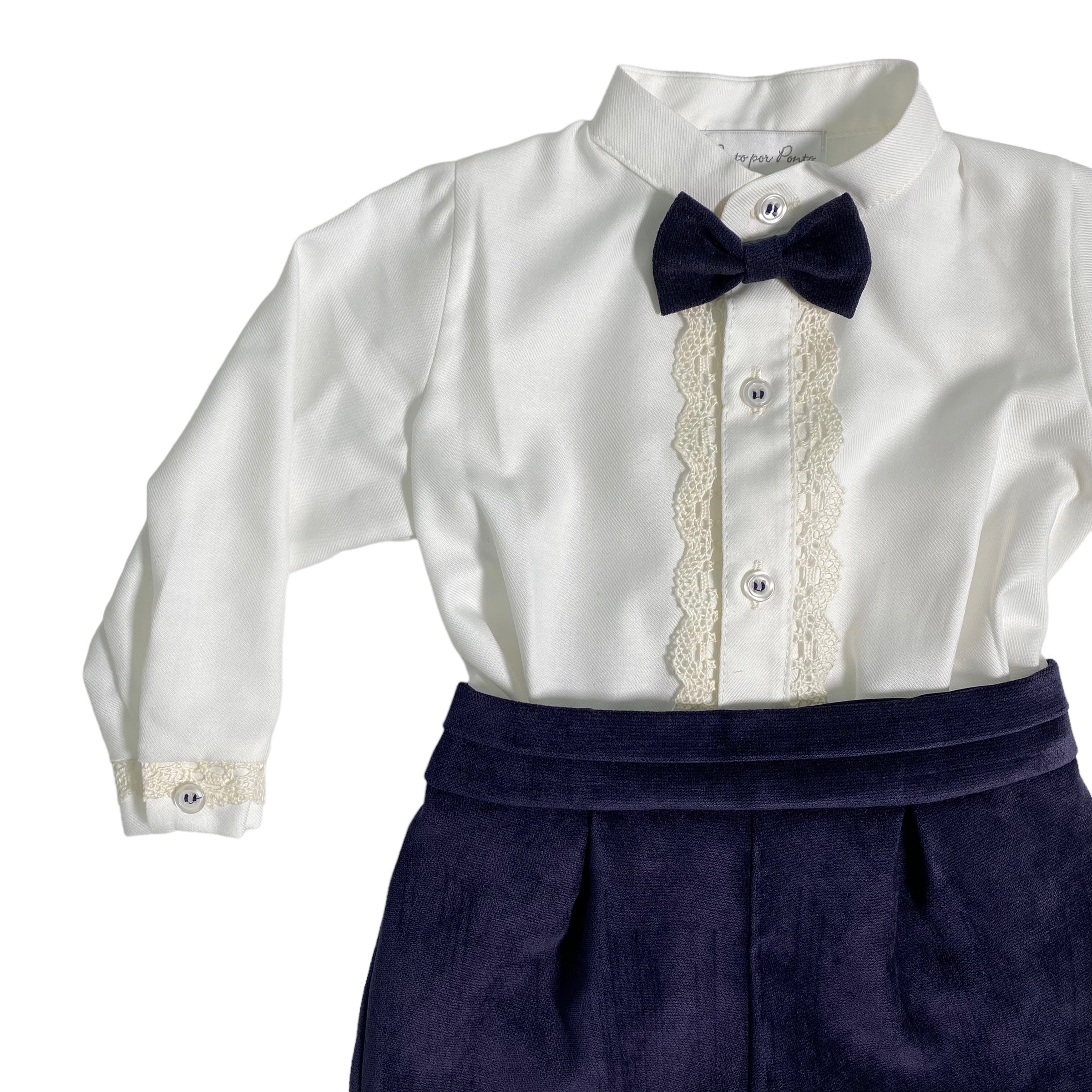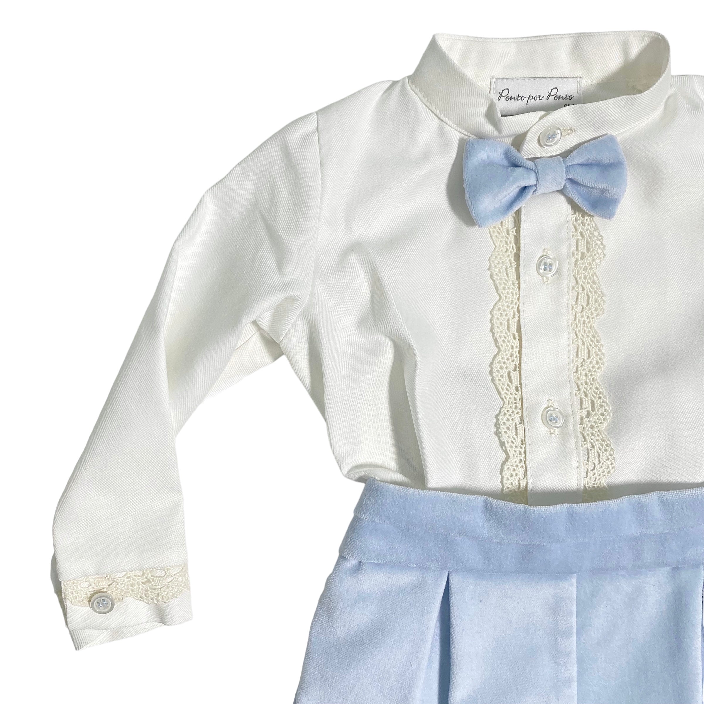 -camicia manica lunga in caldo cotone con collo alla coreana ,parte centrale impreziosita da pizzo lo stesso che ritroviamo anche sui polsini ,chiusura con bottoni sul davanti