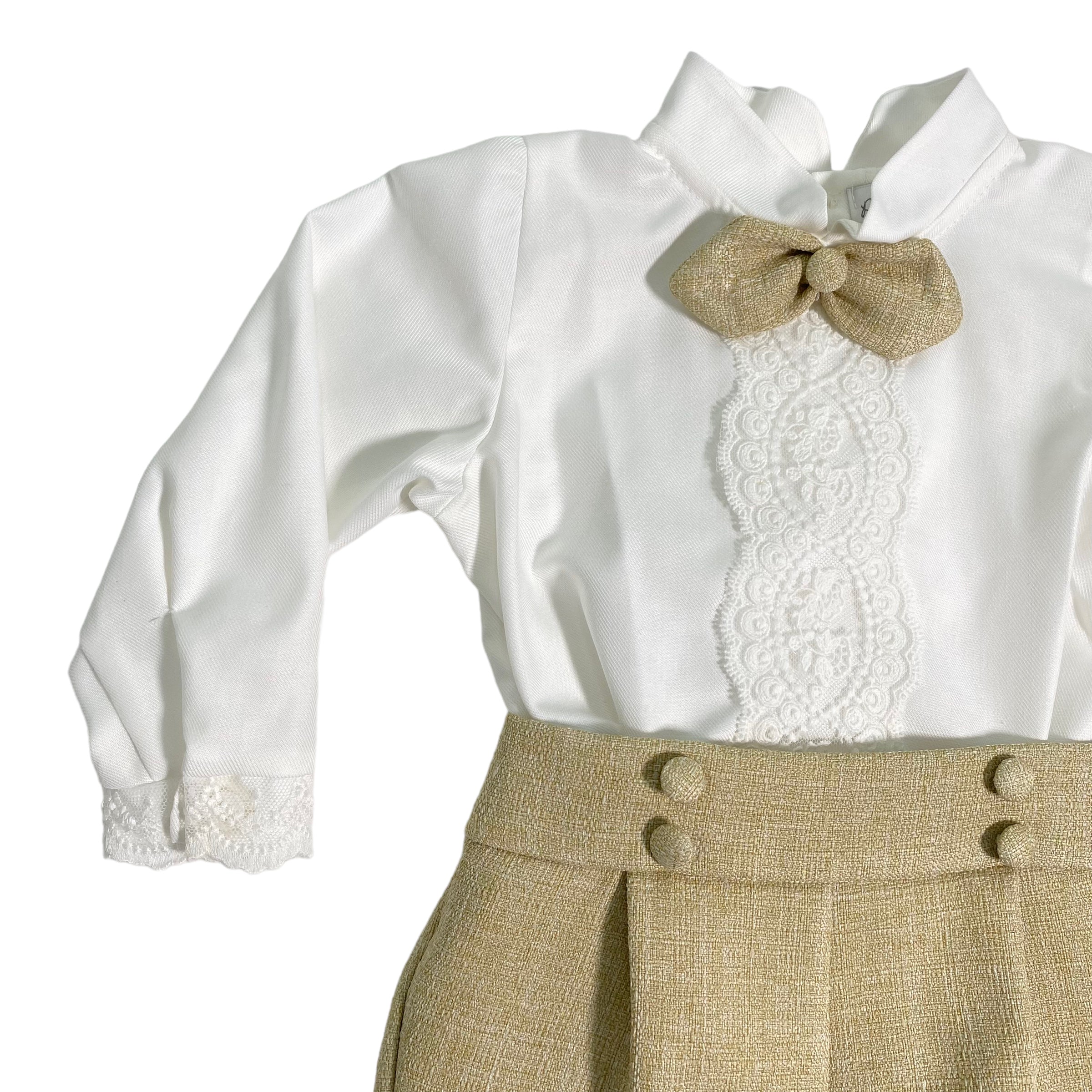 -camicia manica lunga in caldo cotone colletto coreano ,e arricchita da pizzo da fascia di pizzo nella parte centrale ,polsini anch'essi rifiniti con pizzo ,chiusura sul retro con bottoni