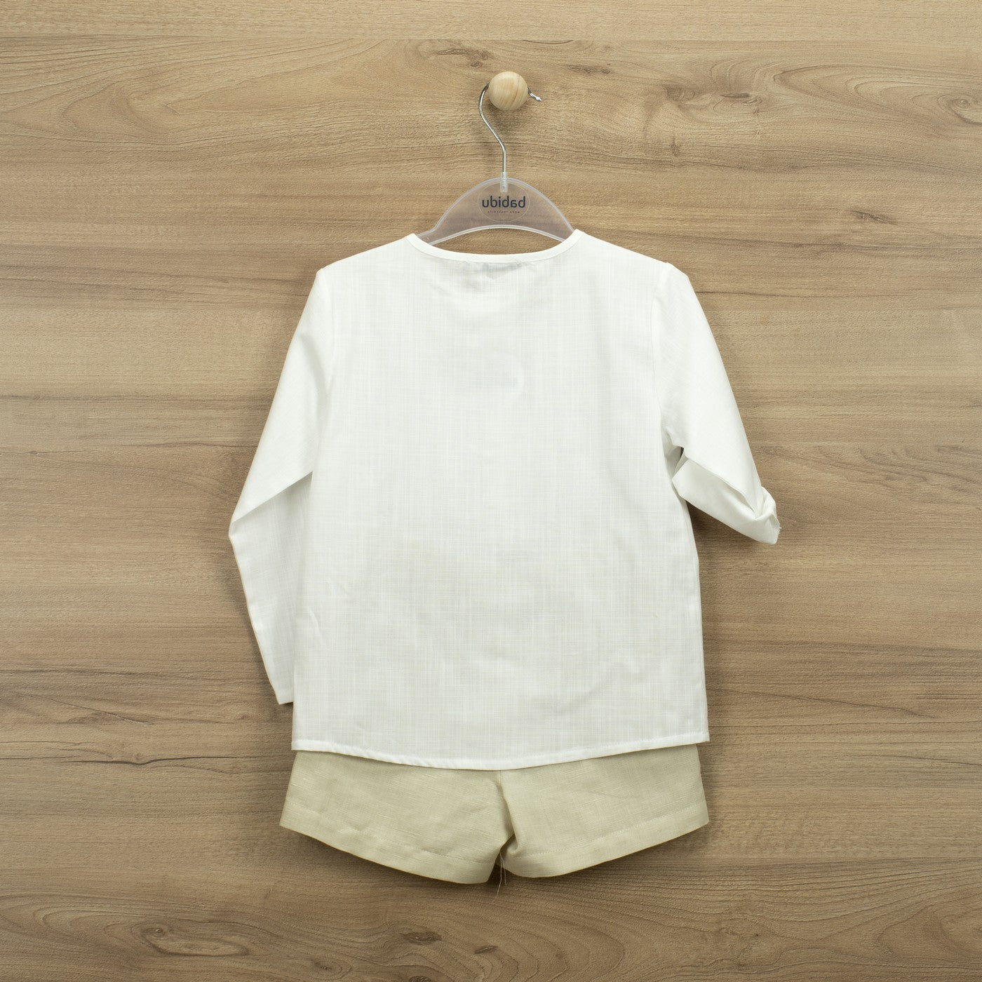 white cotton shirt with Korean collar, long sleeve, but can become half sleeve. Small opening on the front with simple wooden buttons.