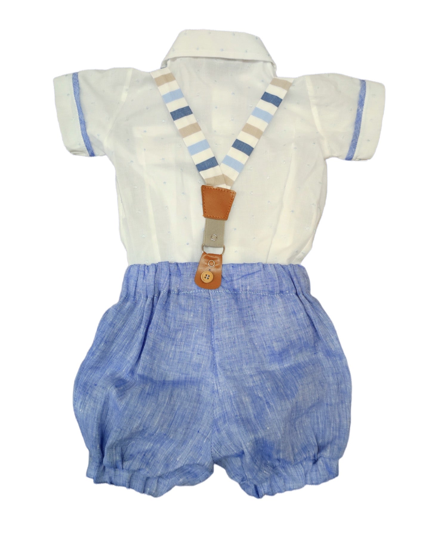 Dungarees with suspenders with blue, light blue, white and beige horizontal stripes, with leather details, can be adjustable. Attachment to the shorts with wooden buttons.