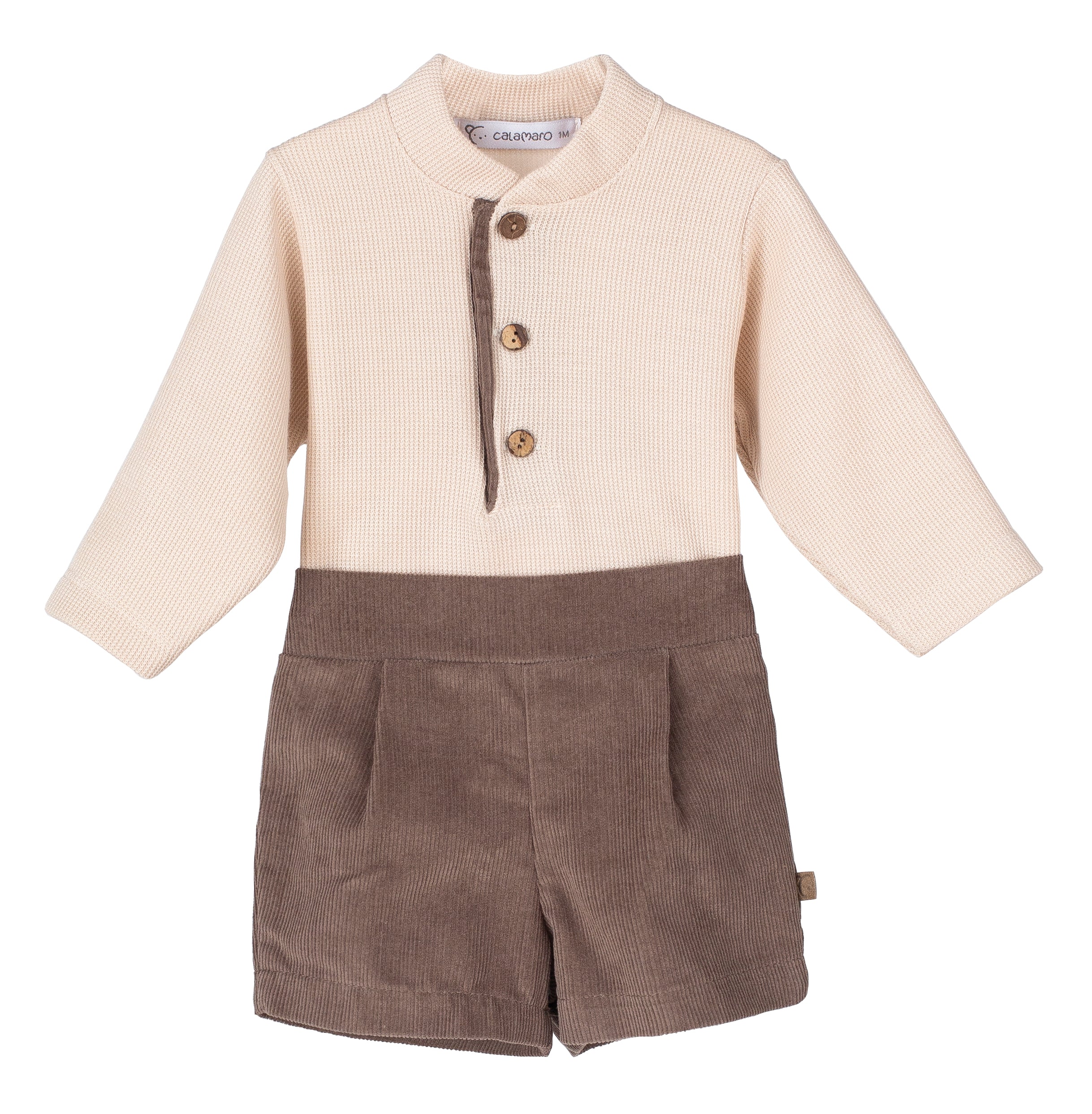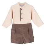 Completo composto da bermuda in velluto in tinta unita marrone e maglia in cldo cotone beige con bottoncini in legno.