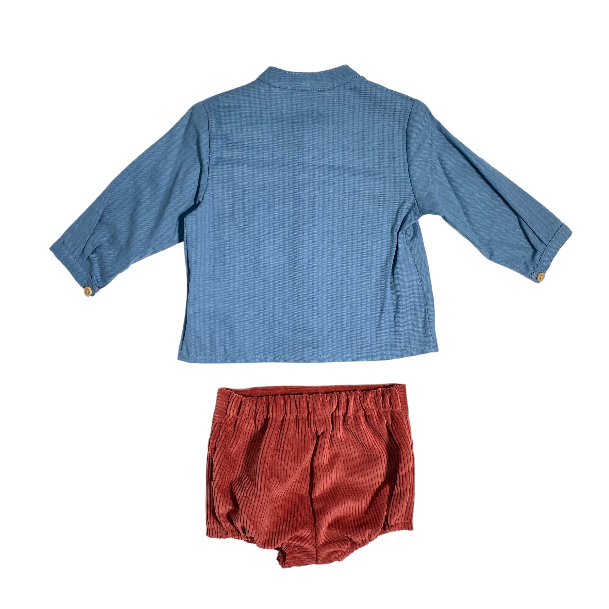 Completo con bermuda in velluto millerighe coccio e camicia in caldo cotone bluette.