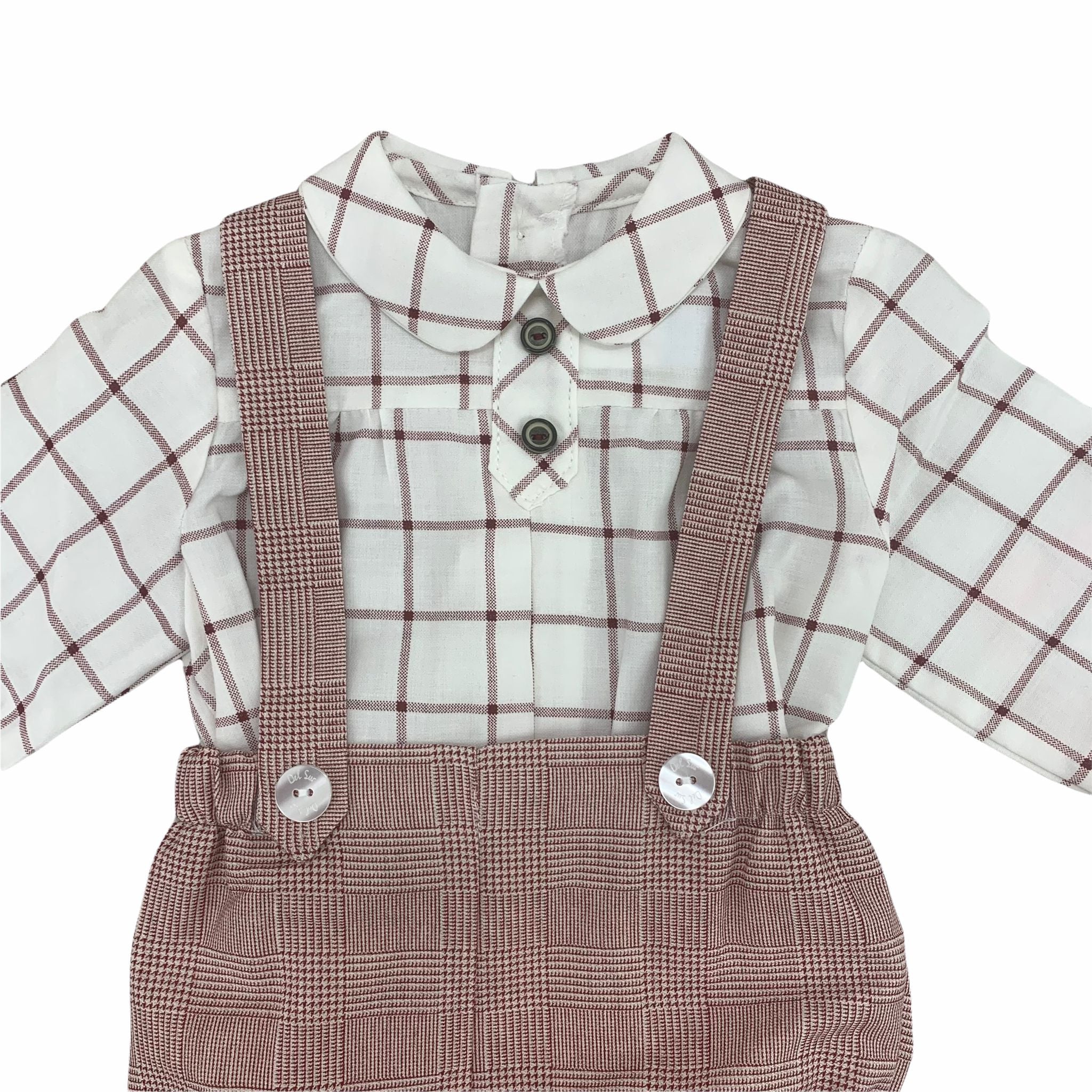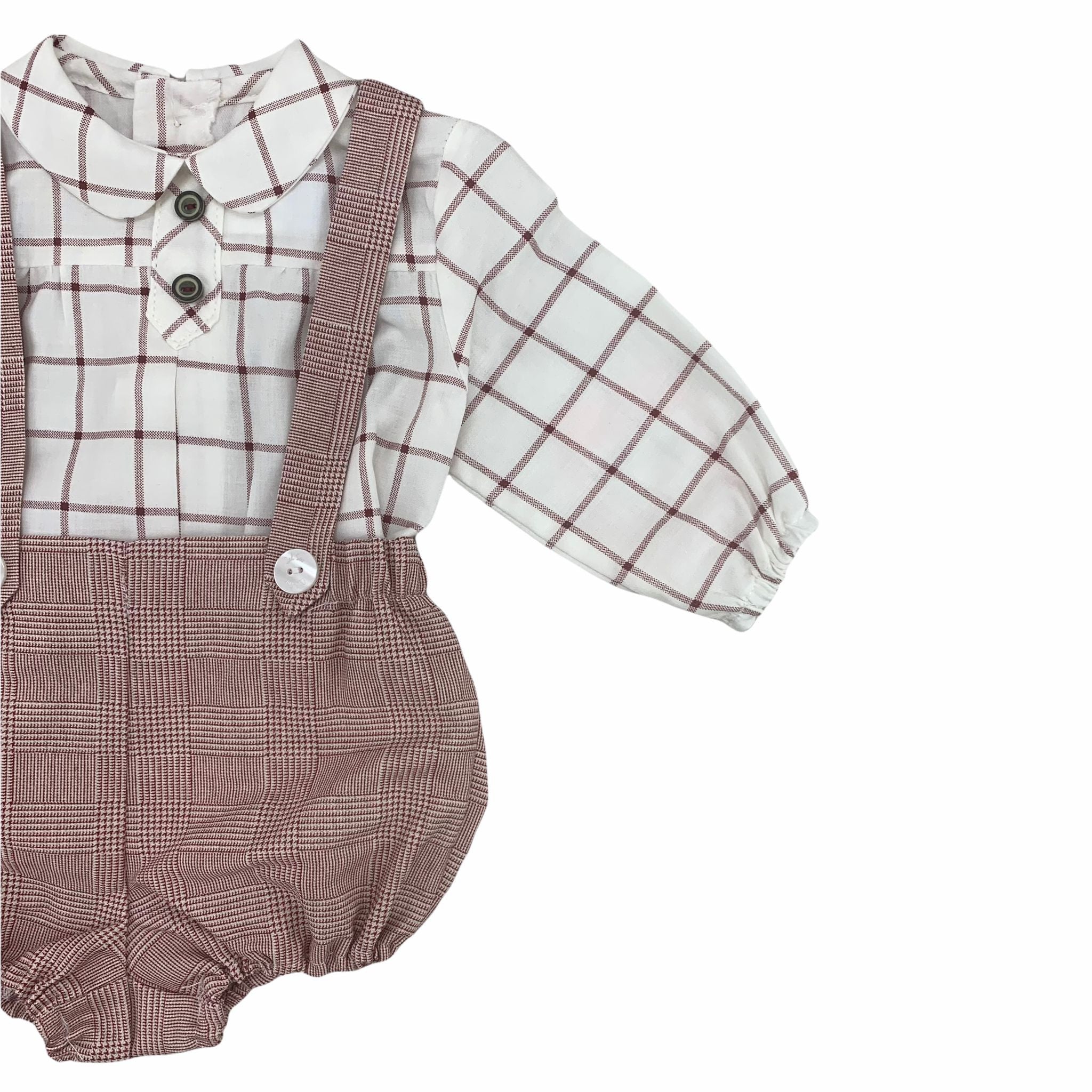 Set consisting of culottes with suspenders, checked pattern and checked shirt with back closure.