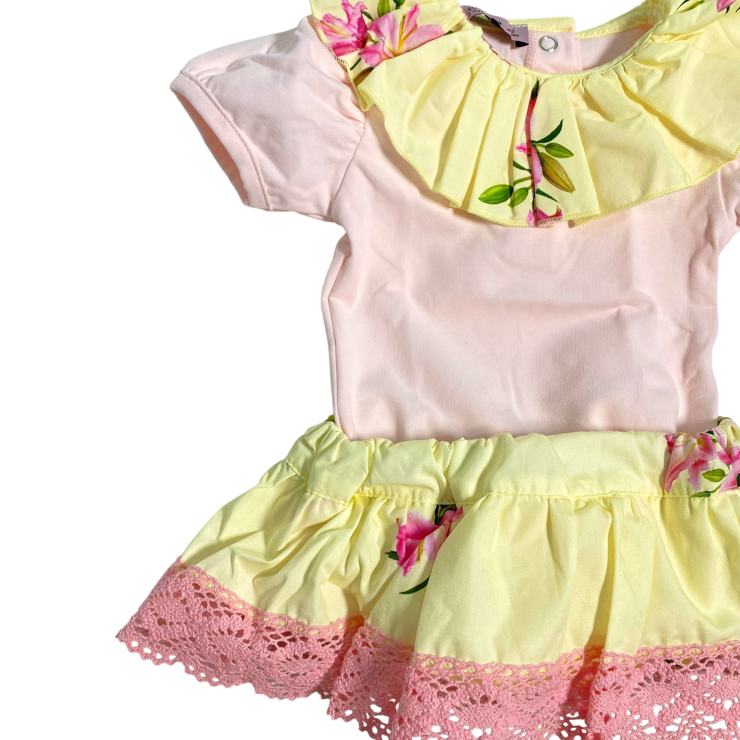 Maestoso e adorabile, questo completo per neonata della Phy Clothing è un must-have per il guardaroba della tua bimba. Include una culotte a gonnellina con una dolce fantasia floreale, e un body con collo rouché abbinato. Ideale per un look semplice ma elegante.
