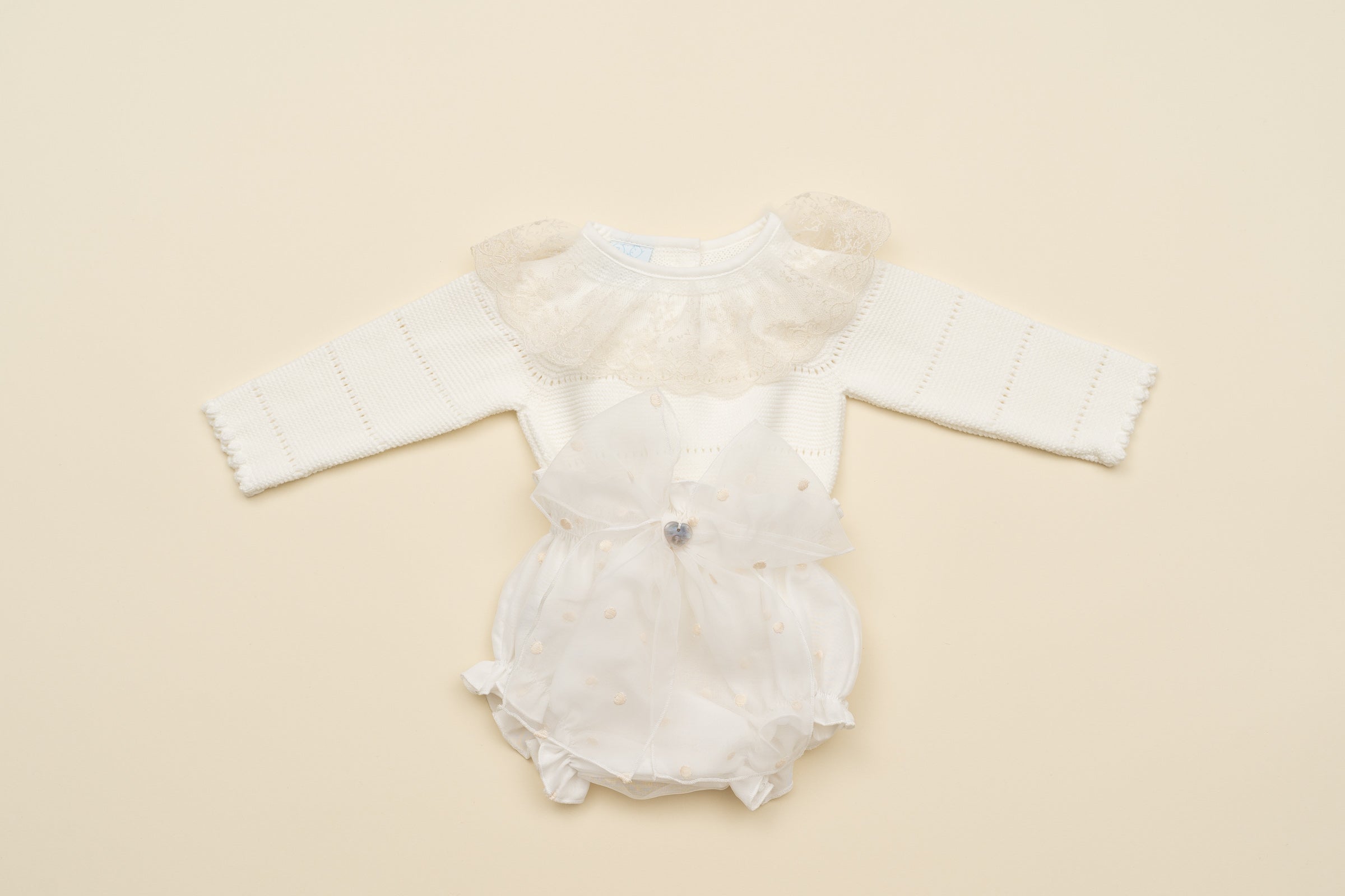 Complete consisting of culottes in cream organza with bow on the front and sweater in cream hypoallergenic fabric with lace application on the neck.