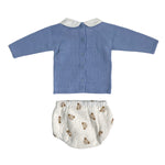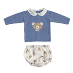 Elegante completo per neonato composto da culotte in garza di cotone con stampa di orsetti e maglioncino in acrilico con ricamo orsetto e colletto tondo in cotone. Perfetto per una raffinata uscita in clinica, questo abbigliamento aggiungerà un tocco di moda al tuo piccolo.