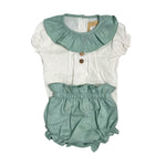 Il Completo Con Culotte In Cotone Neonata BABY FASHION offre un look elegante e alla moda grazie alla camicia mezza manica con collo rouché e bottoncini in legno. Realizzato in cotone, è comodo e di alta qualità. Il set completo include anche le culotte. Perfetto per ogni occasione.