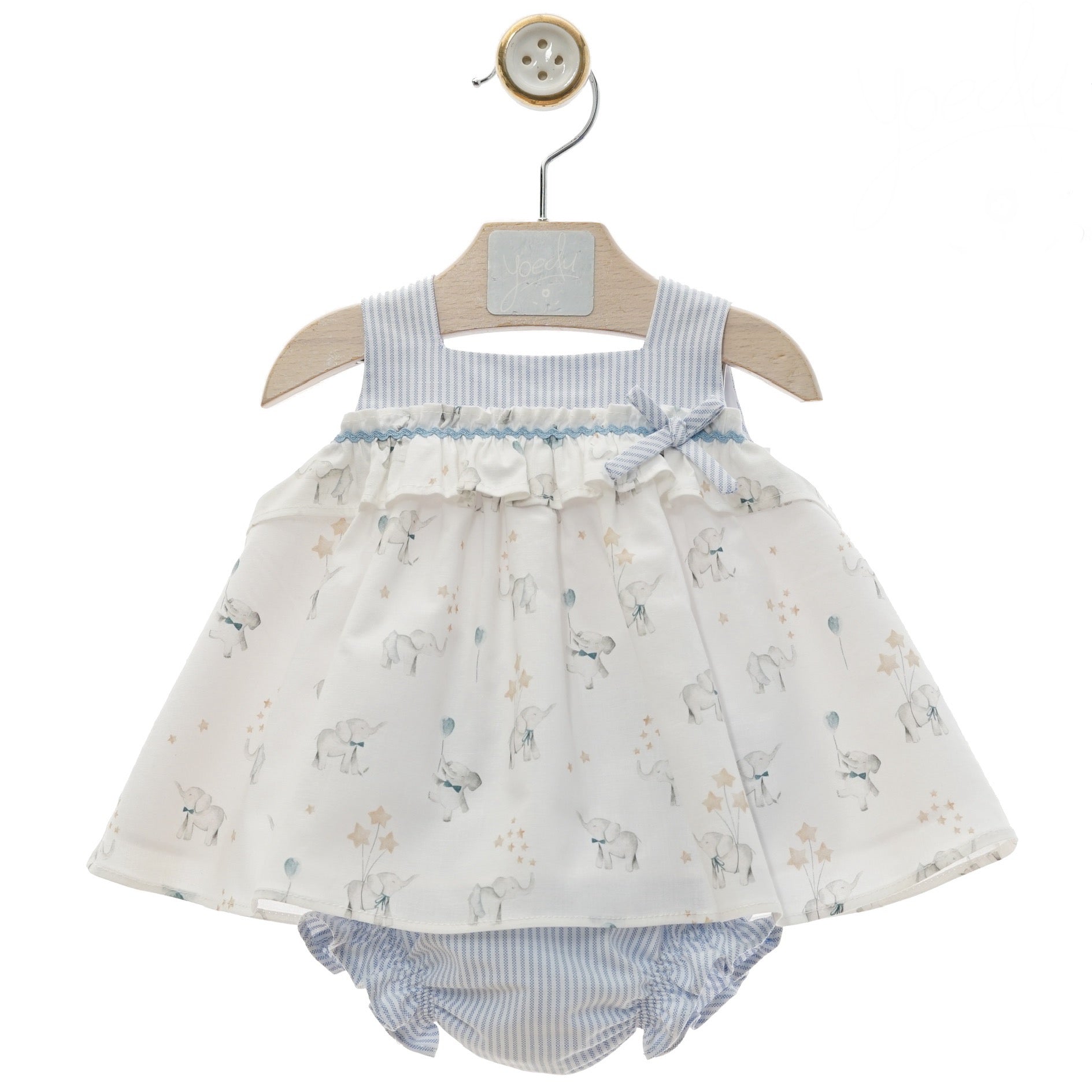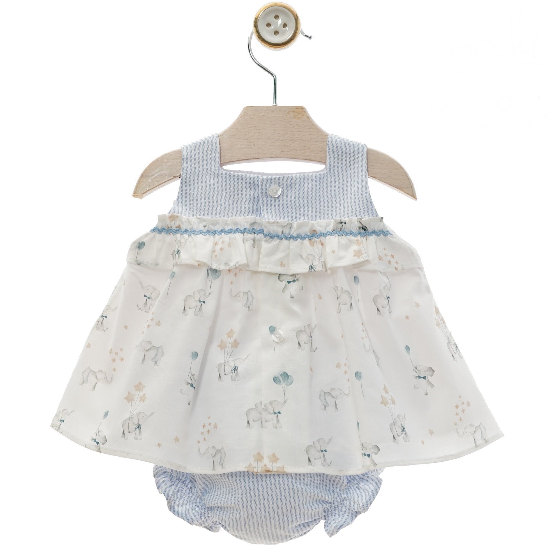 Esaltiamo la grazia della tua neonata con il completo con culotte in cotone, caratterizzato da una camicia smanicata con una tenera stampa di elefantini. Elegante e casual, questo outfit è perfetto per ogni occasione.