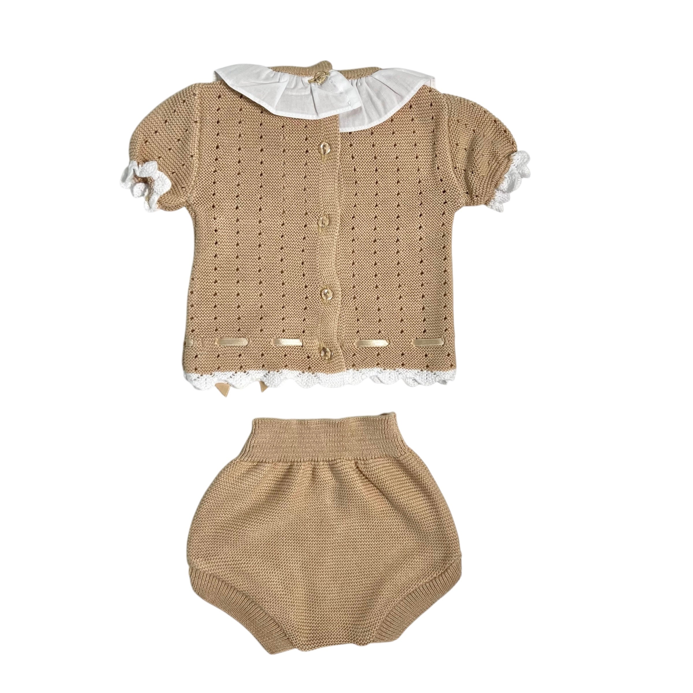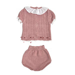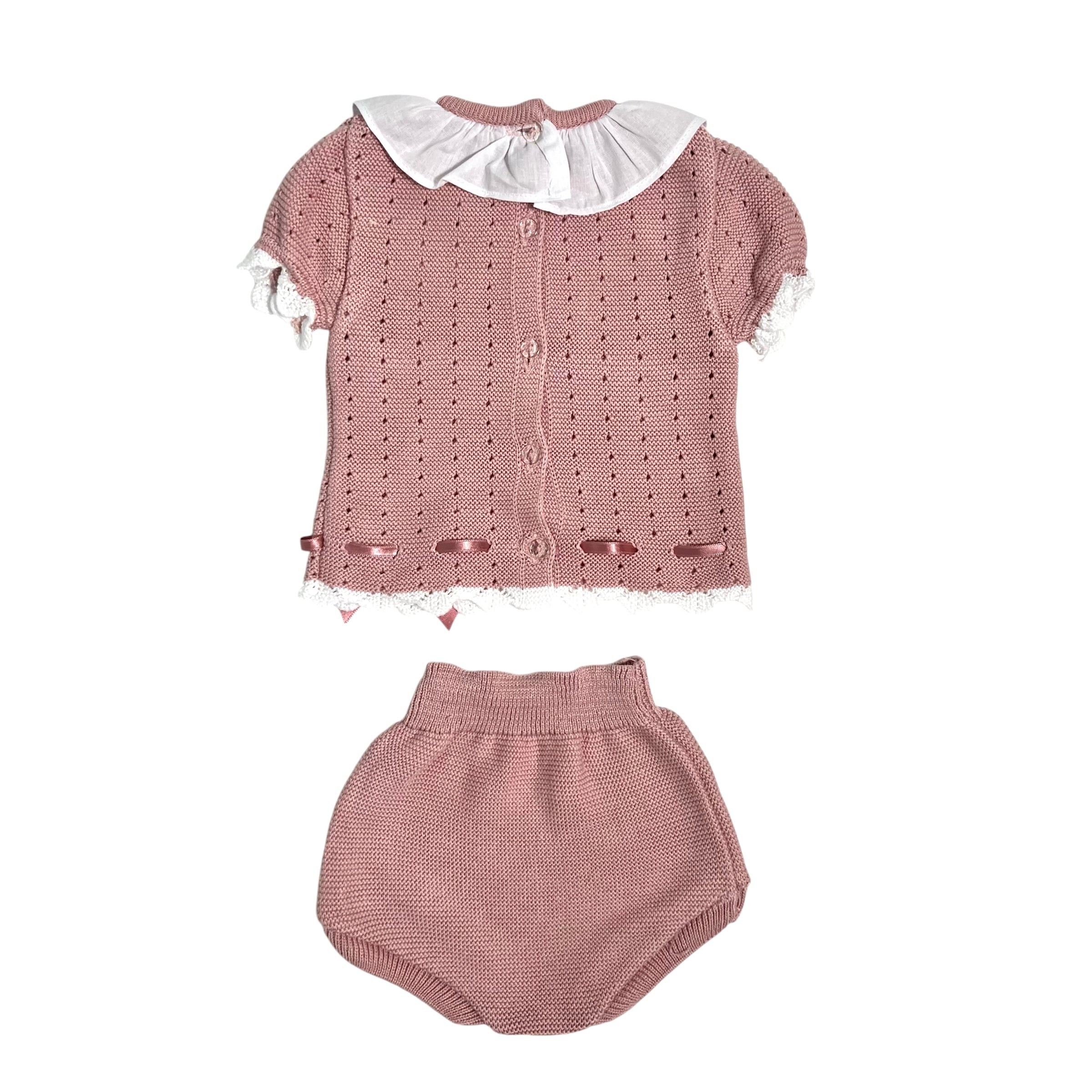 Questo completo due pezzi è perfetto per la tua neonata. Realizzato in filo di cotone, offre un look elegante e alla moda grazie ai dettagli raffinati come la culotte e la maglia traforata con fiocco in raso e collo rouché. Comodo e raffinato, perfetto per ogni occasione.