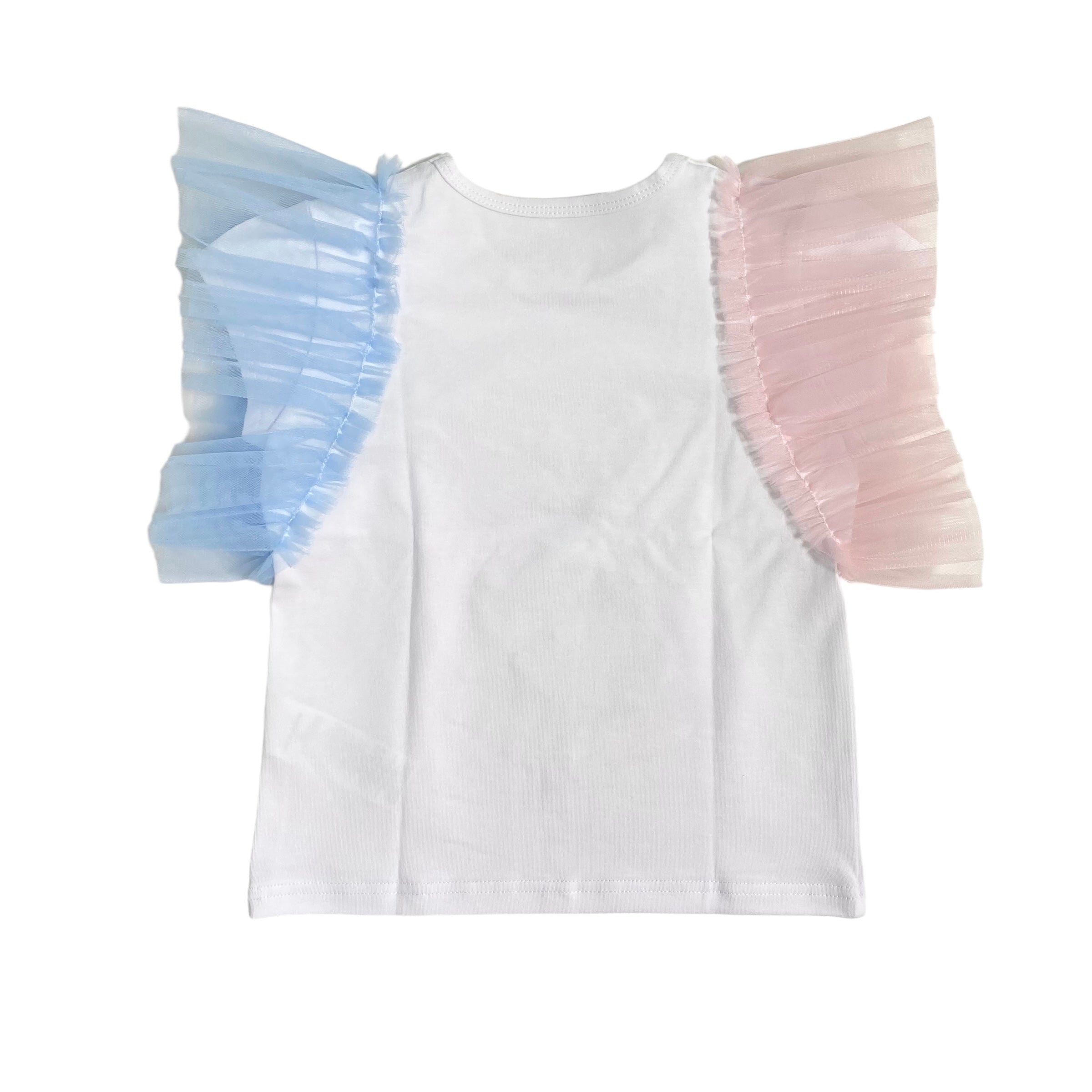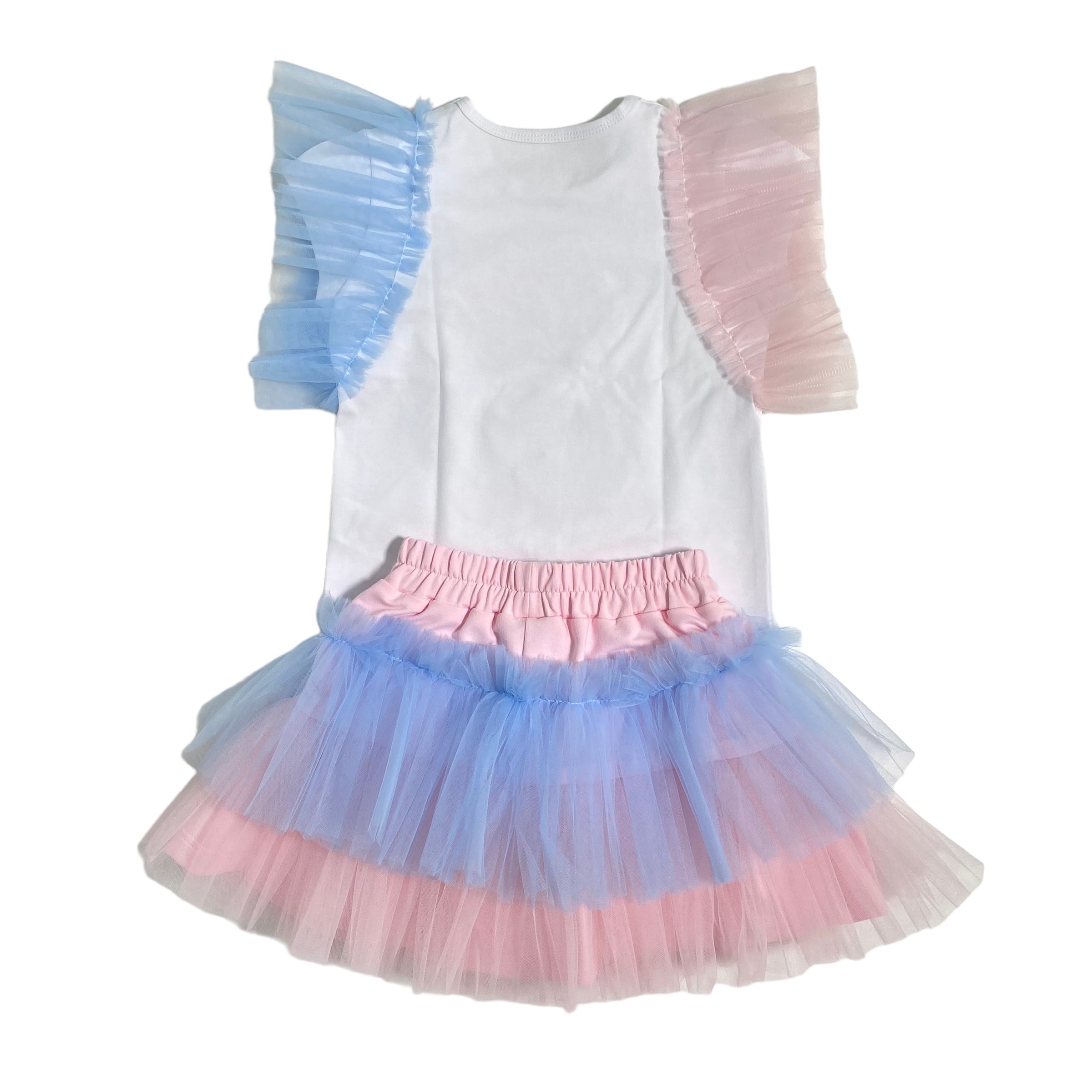Questo completo elegante e chic per bambina include una gonna in tulle a balze con elastico in vita per una vestibilità comoda, abbinata ad una t-shirt con maniche in tulle. La fantastica applicazione sul davanti aggiunge un tocco alla moda a questo outfit unico. Perfetto per ogni occasione!