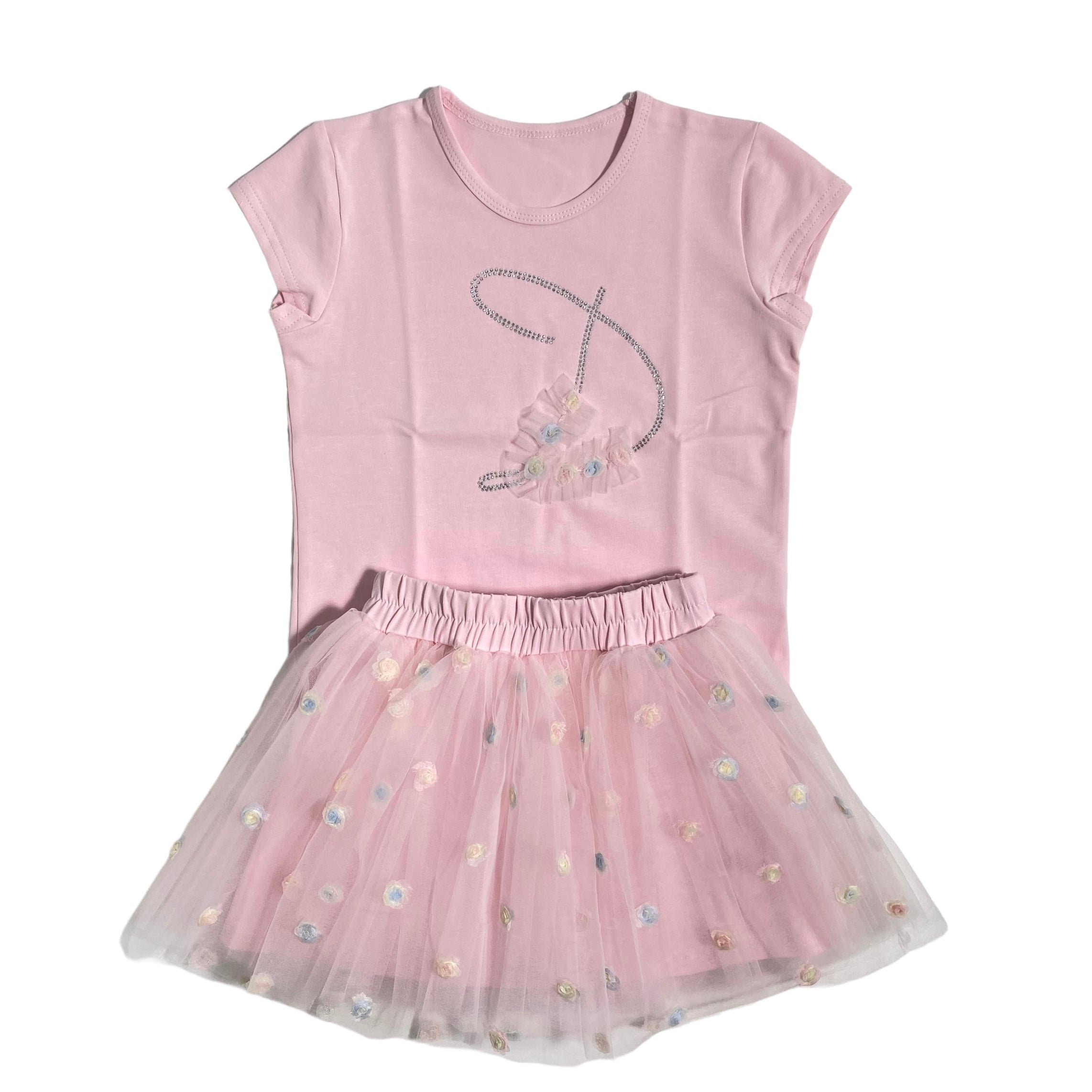 Questo completo elegante e chic per bambina include una gonna in tulle con elastico in vita per una vestibilità comoda, abbinata ad una t-shirt. La fantastica applicazione sul davanti aggiunge un tocco alla moda a questo outfit unico. Perfetto per ogni occasione!