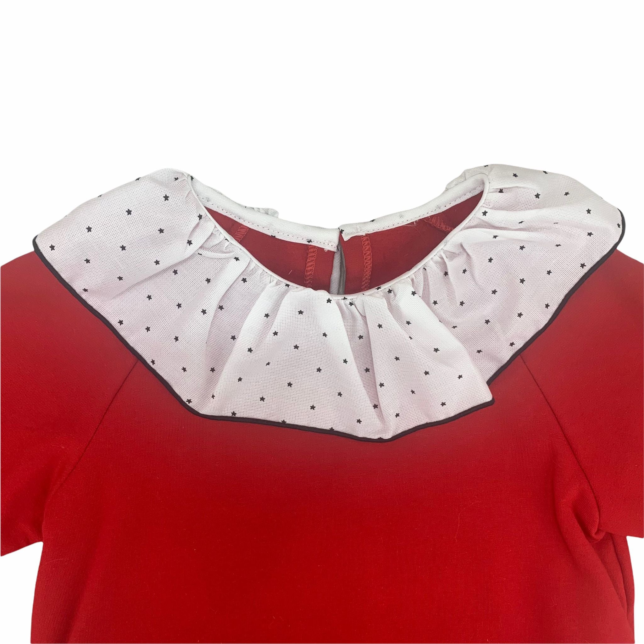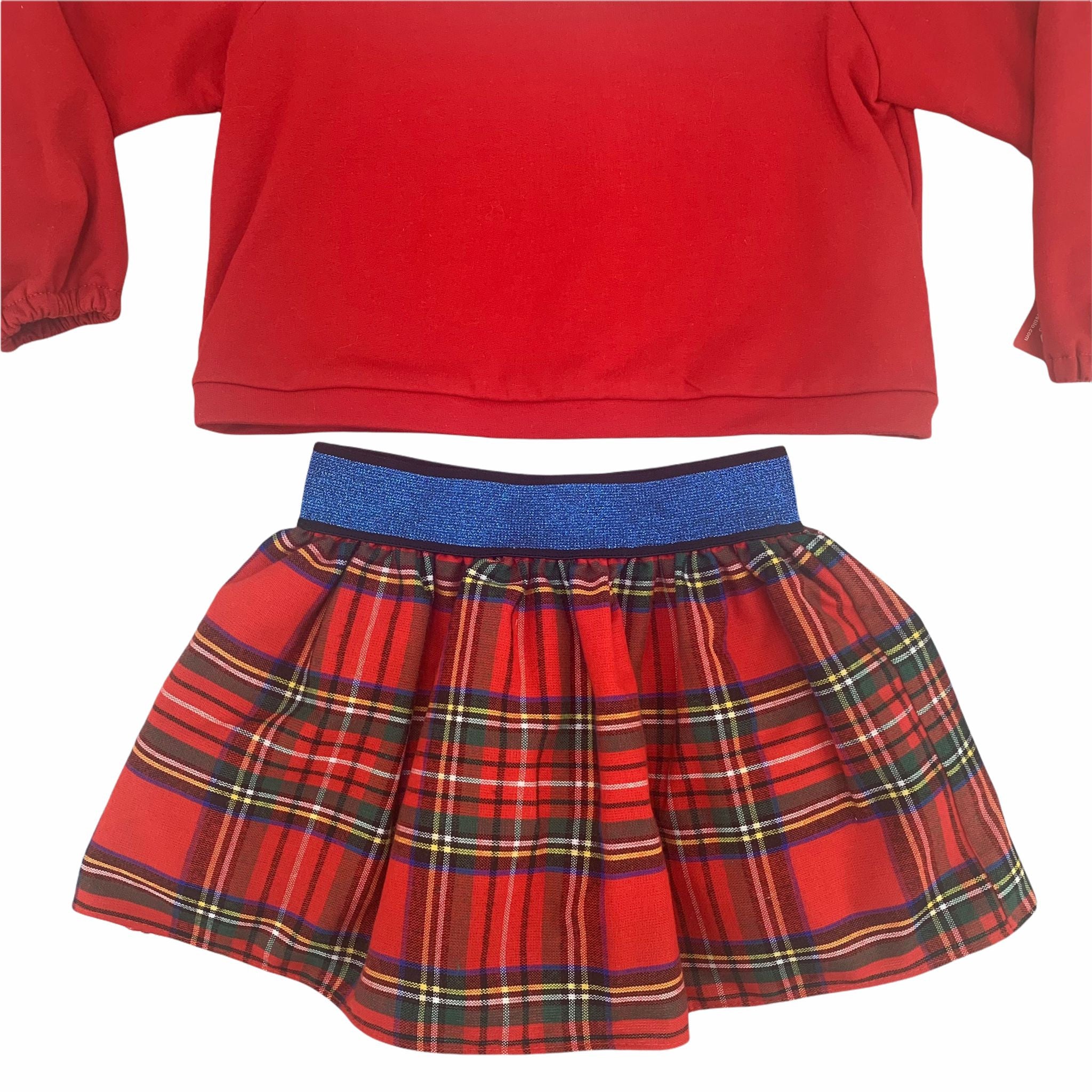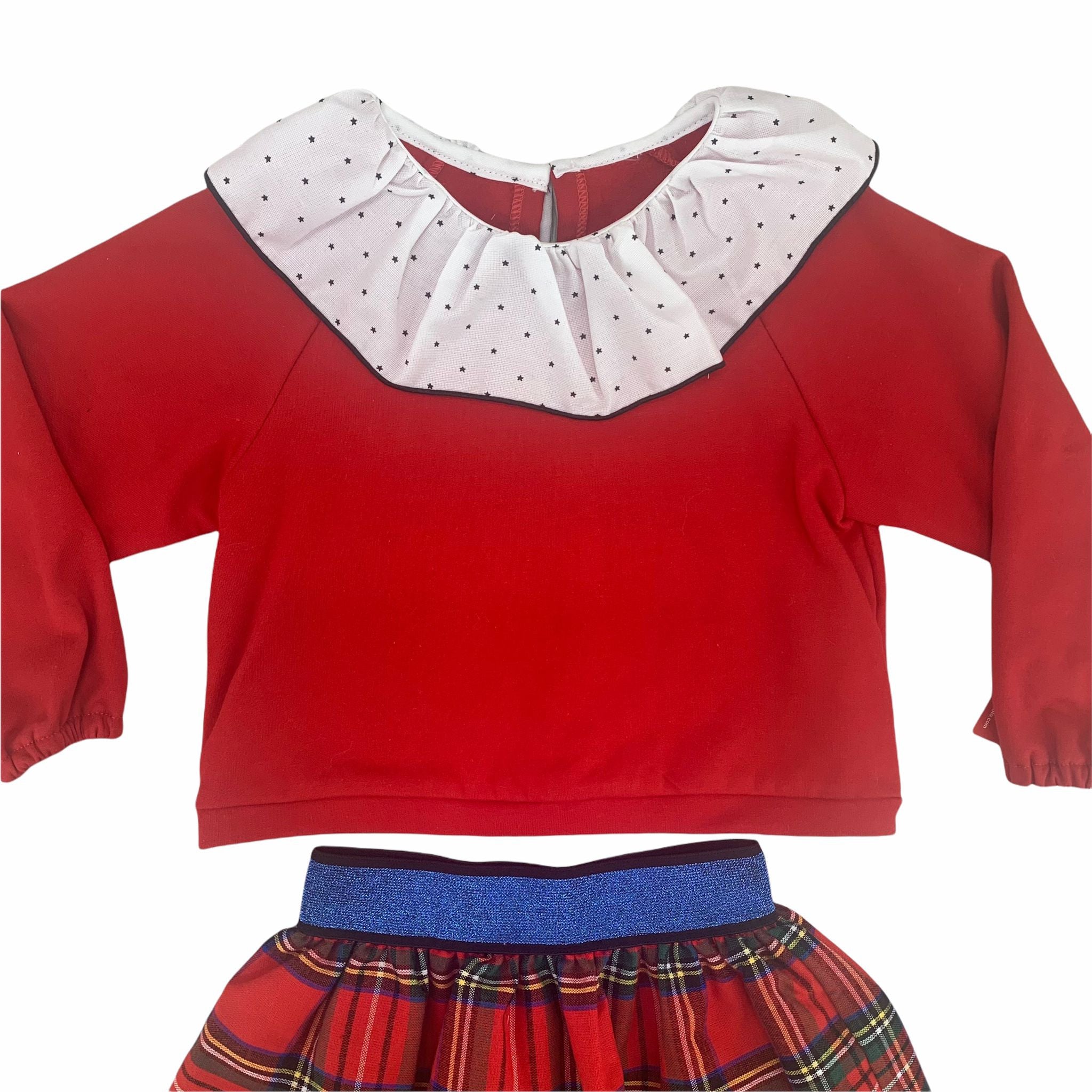 Complete with tartan patterned skirt with elastic waist and white T-shirt with star patterned round neck, long sleeves with elastic at the wrist and back closure.