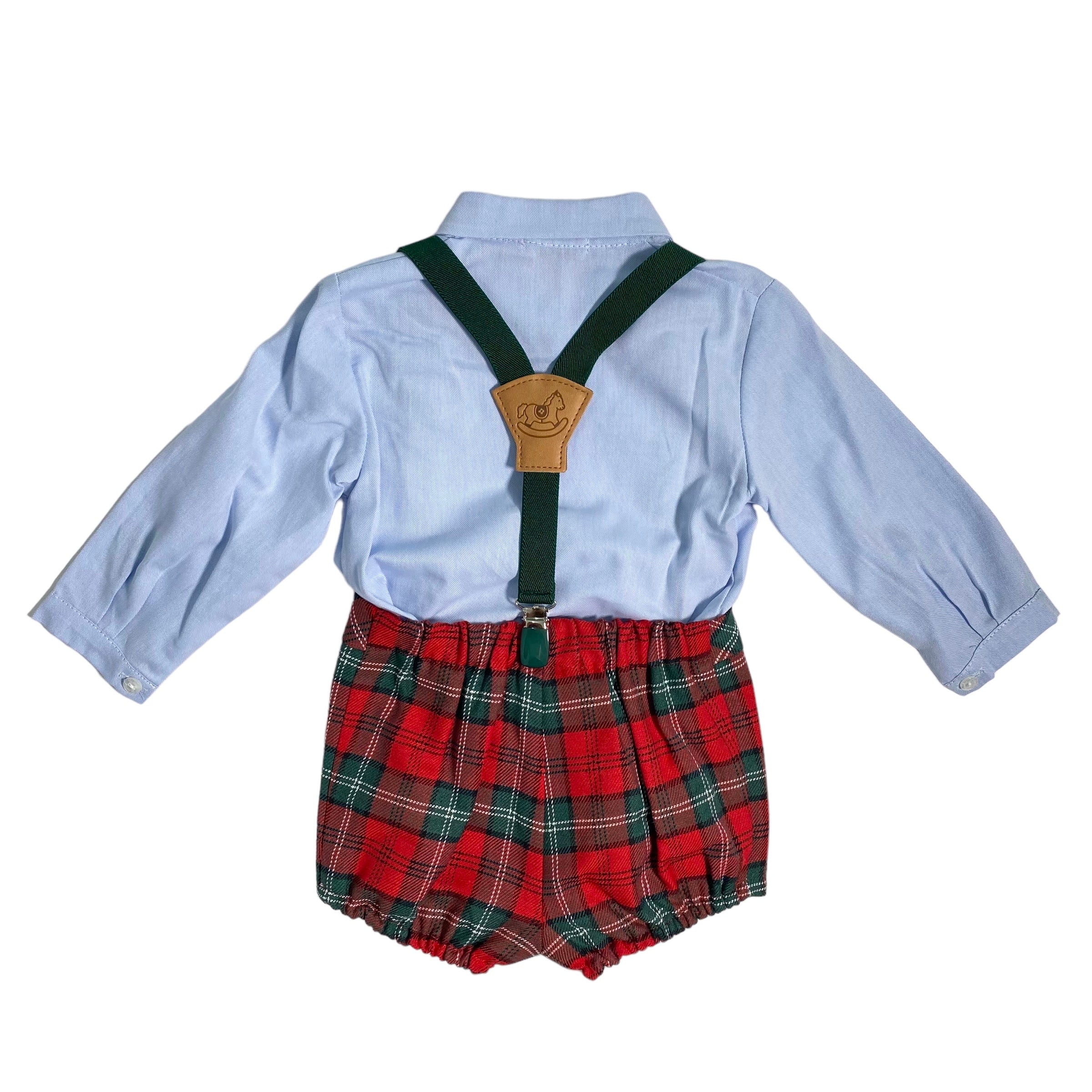 Completo in caldo cotone, con salopette scozzese con bretelle e camicia in tinta unita celeste.