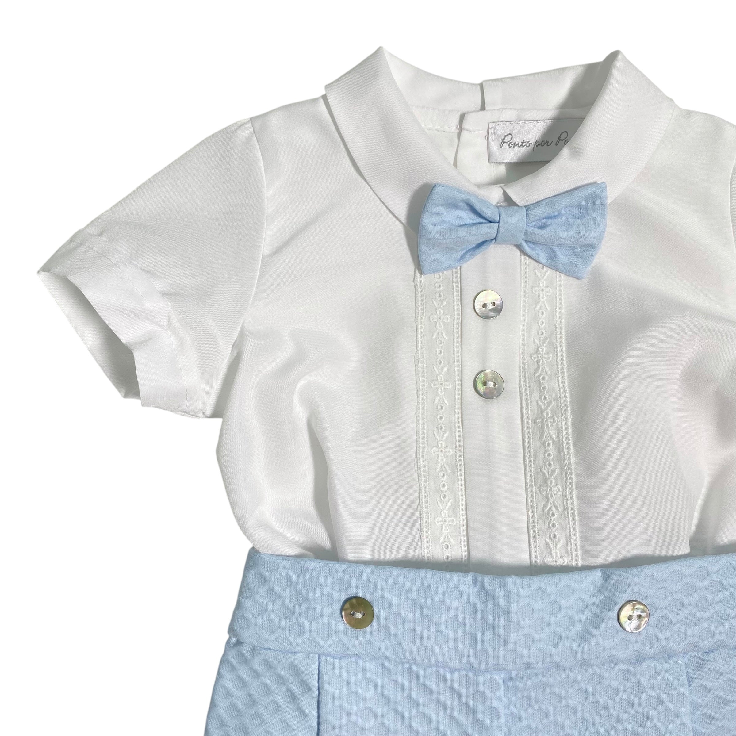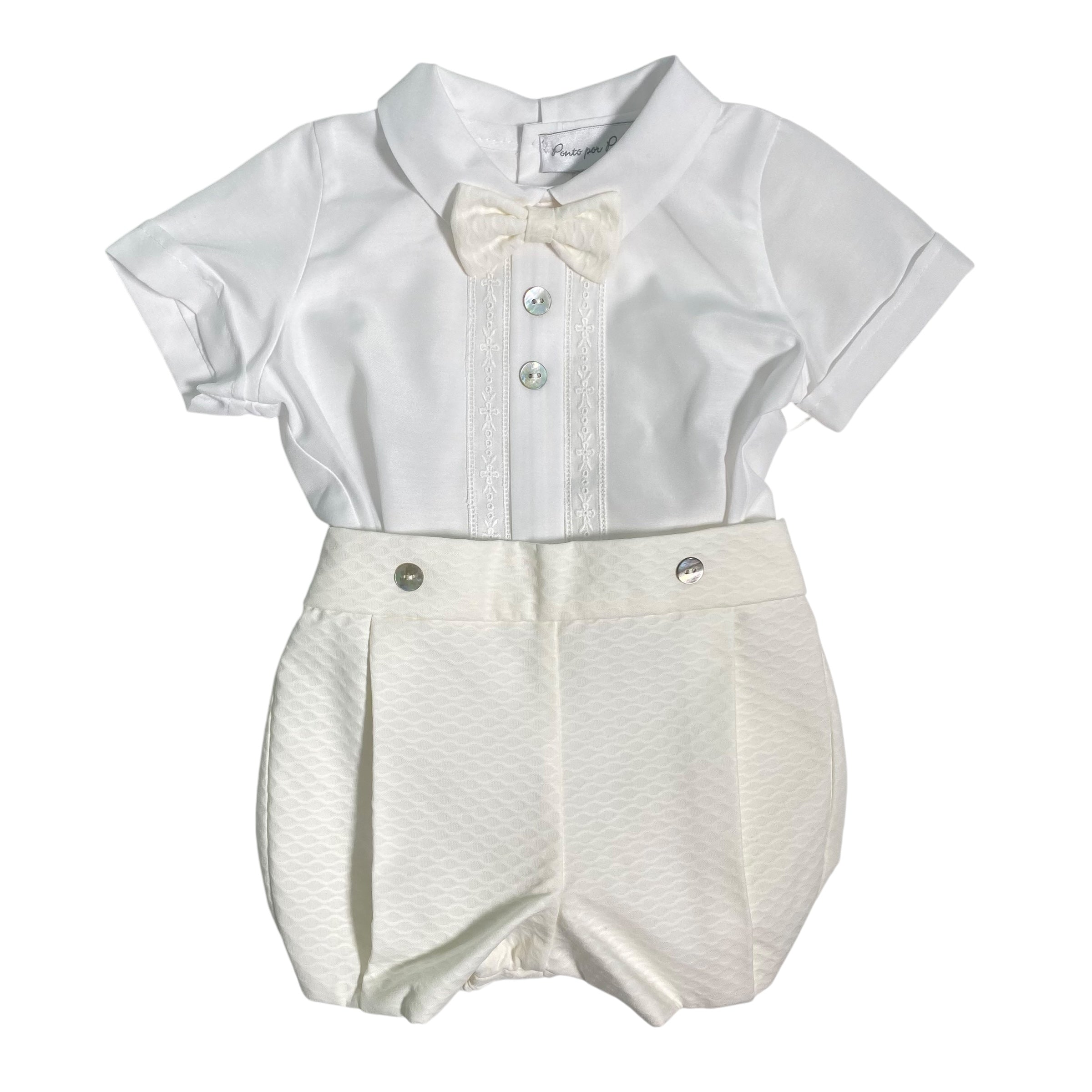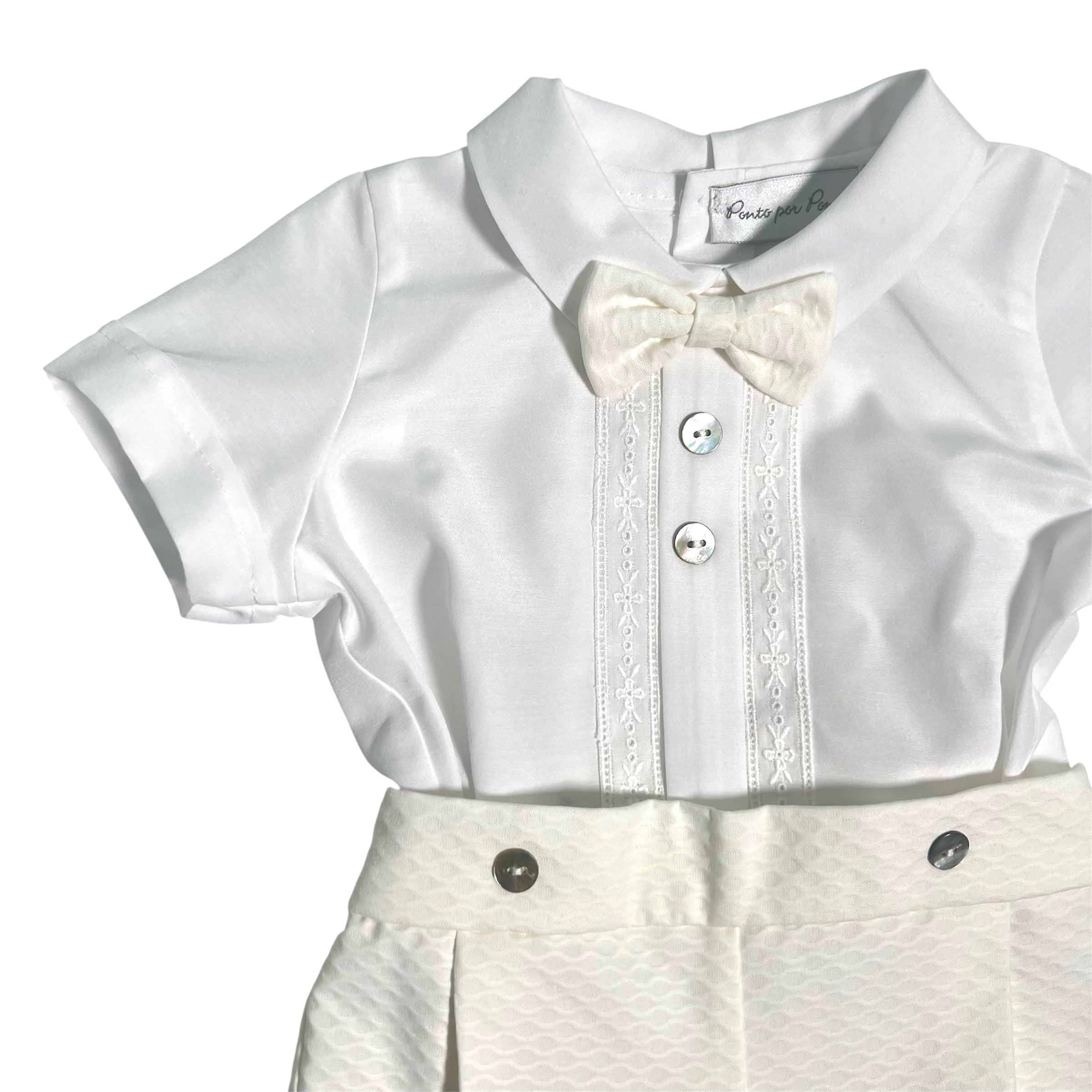 Questo elegante completo in cotone è perfetto per le occasioni speciali del tuo neonato. Il bermuda in tessuto particolare e la camicia mezza manica sono impreziositi con applicazioni di pizzo sul davanti. Completa il look con il papillon abbinato per un tocco di stile.