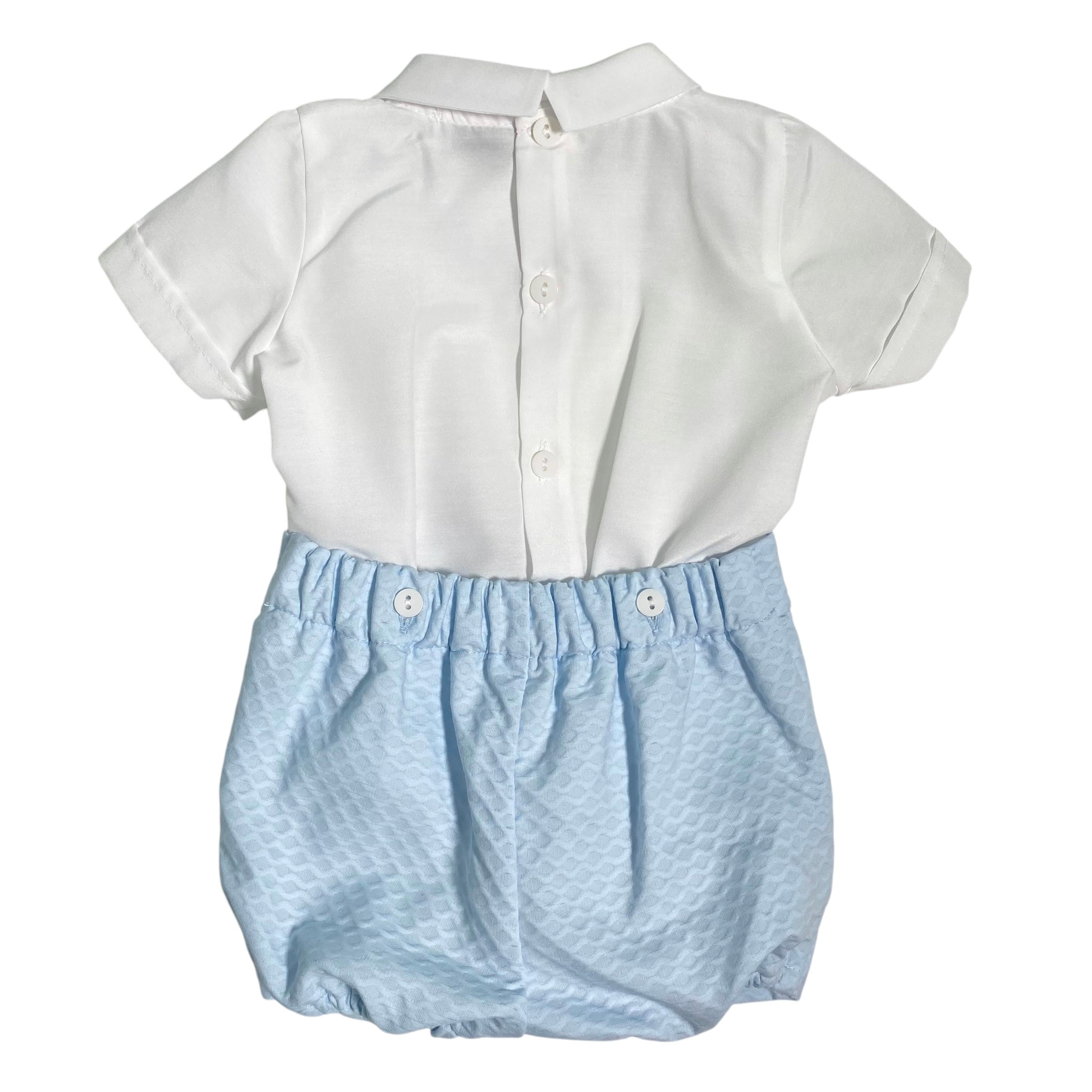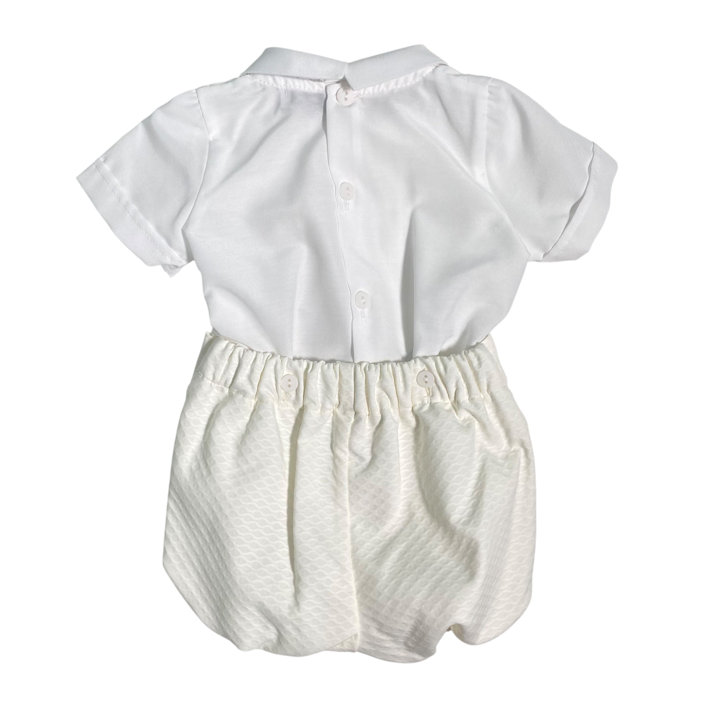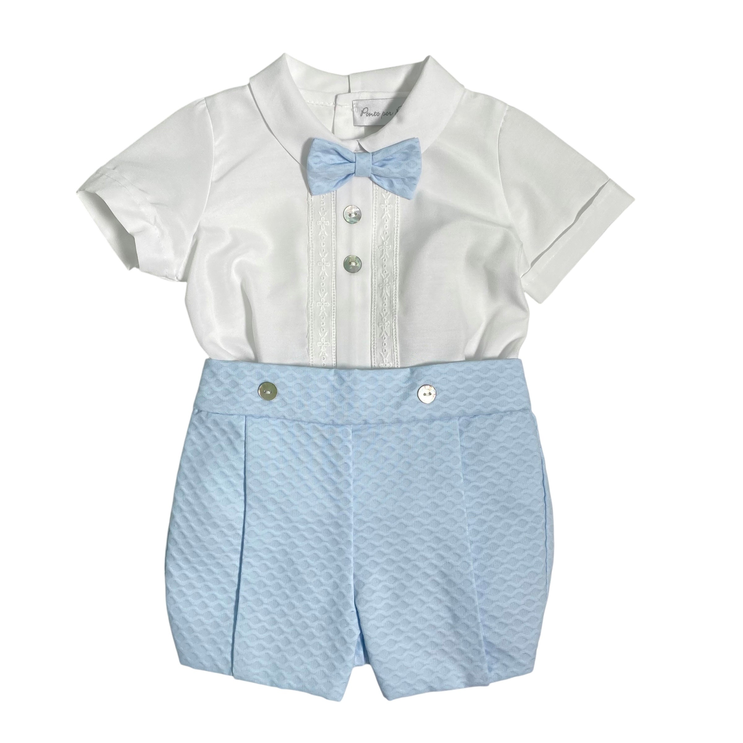 Questo elegante completo in cotone è perfetto per le occasioni speciali del tuo neonato. Il bermuda in tessuto particolare e la camicia mezza manica sono impreziositi con applicazioni di pizzo sul davanti. Completa il look con il papillon abbinato per un tocco di stile.