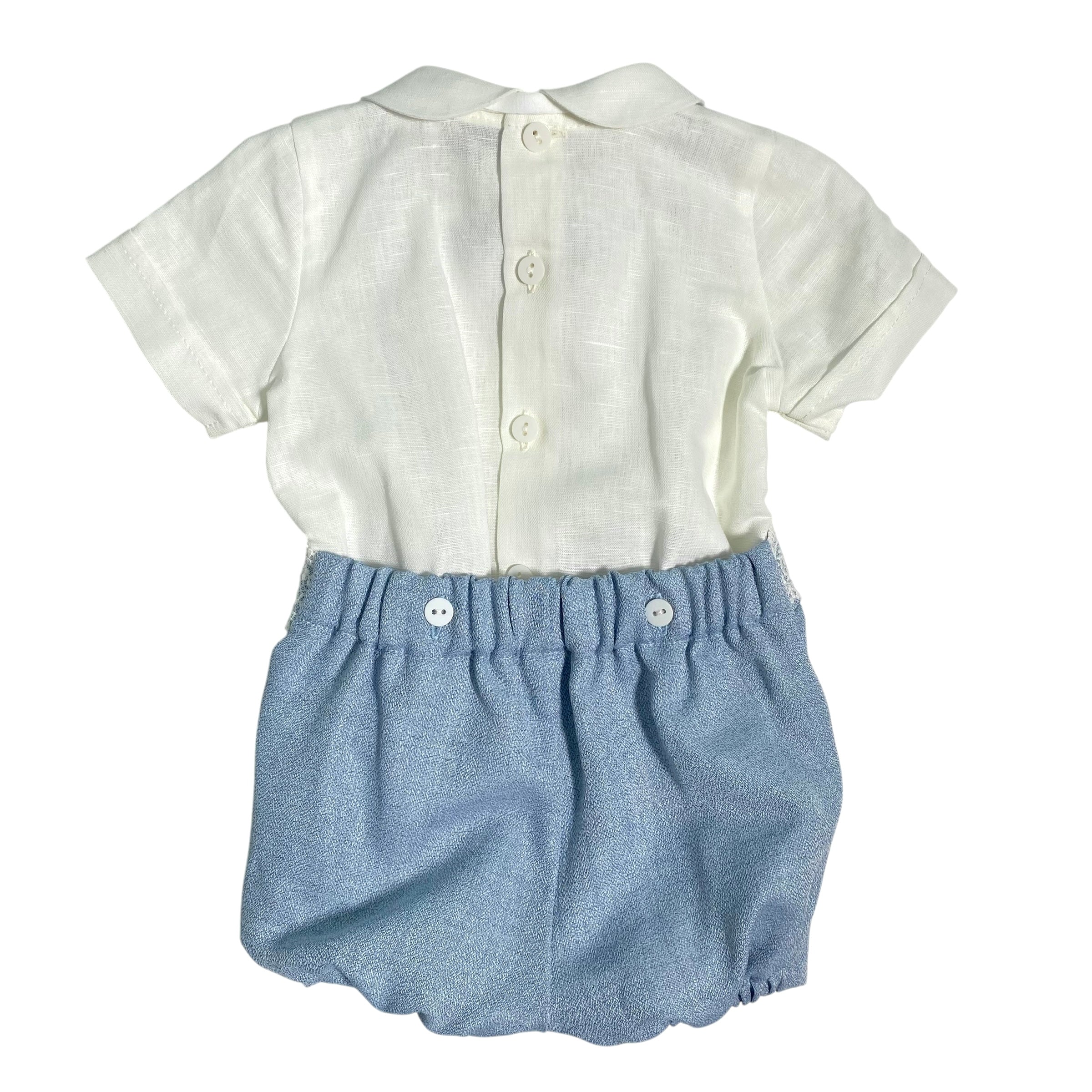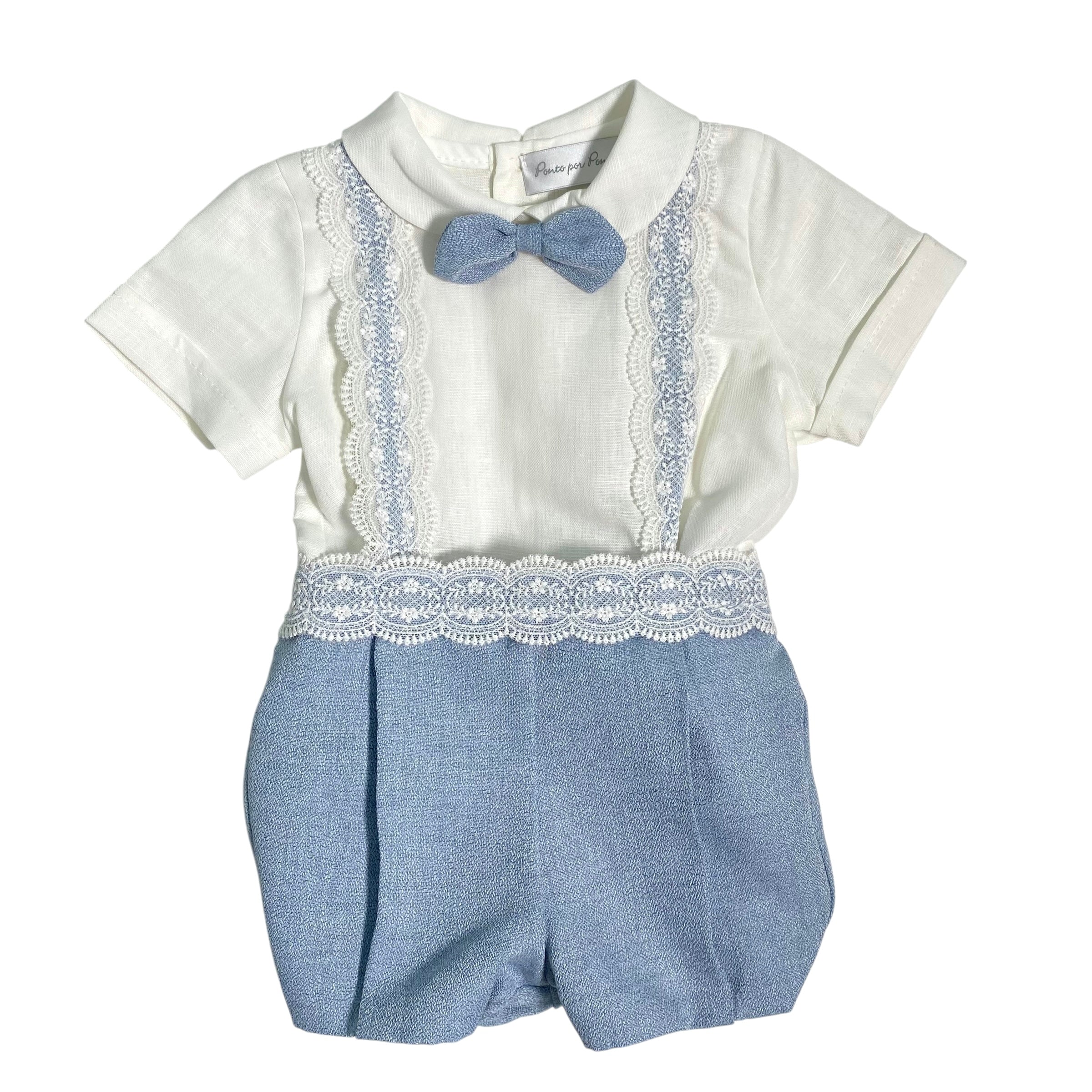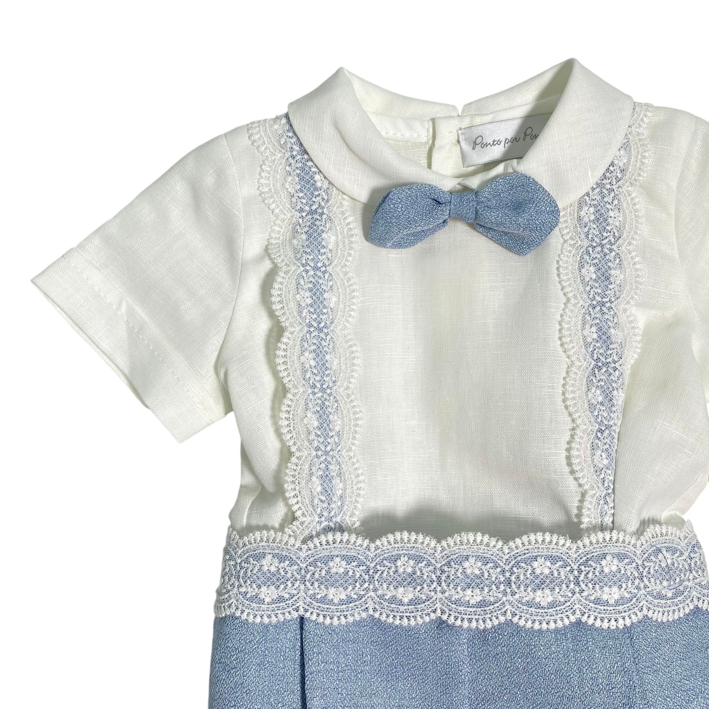 Questo elegante completo in lino è perfetto per le occasioni speciali del tuo neonato. Il bermuda in tessuto particolare e la camicia mezza manica sono impreziositi con applicazioni di pizzo sul davanti e sulla cintura. Completa il look con il papillon abbinato per un tocco di stile.