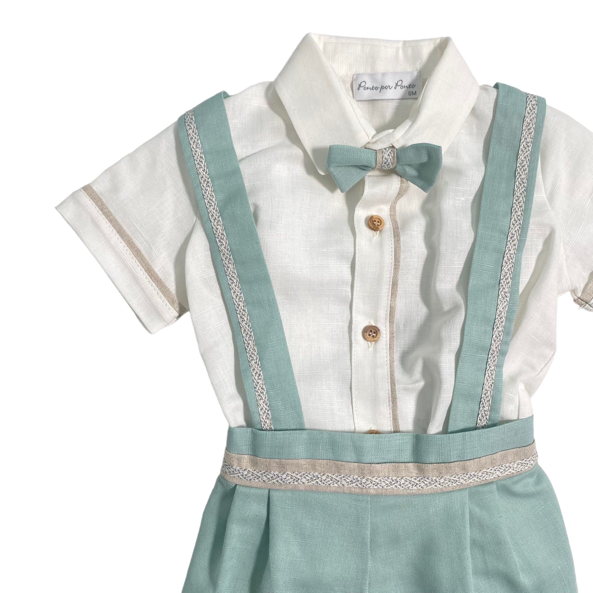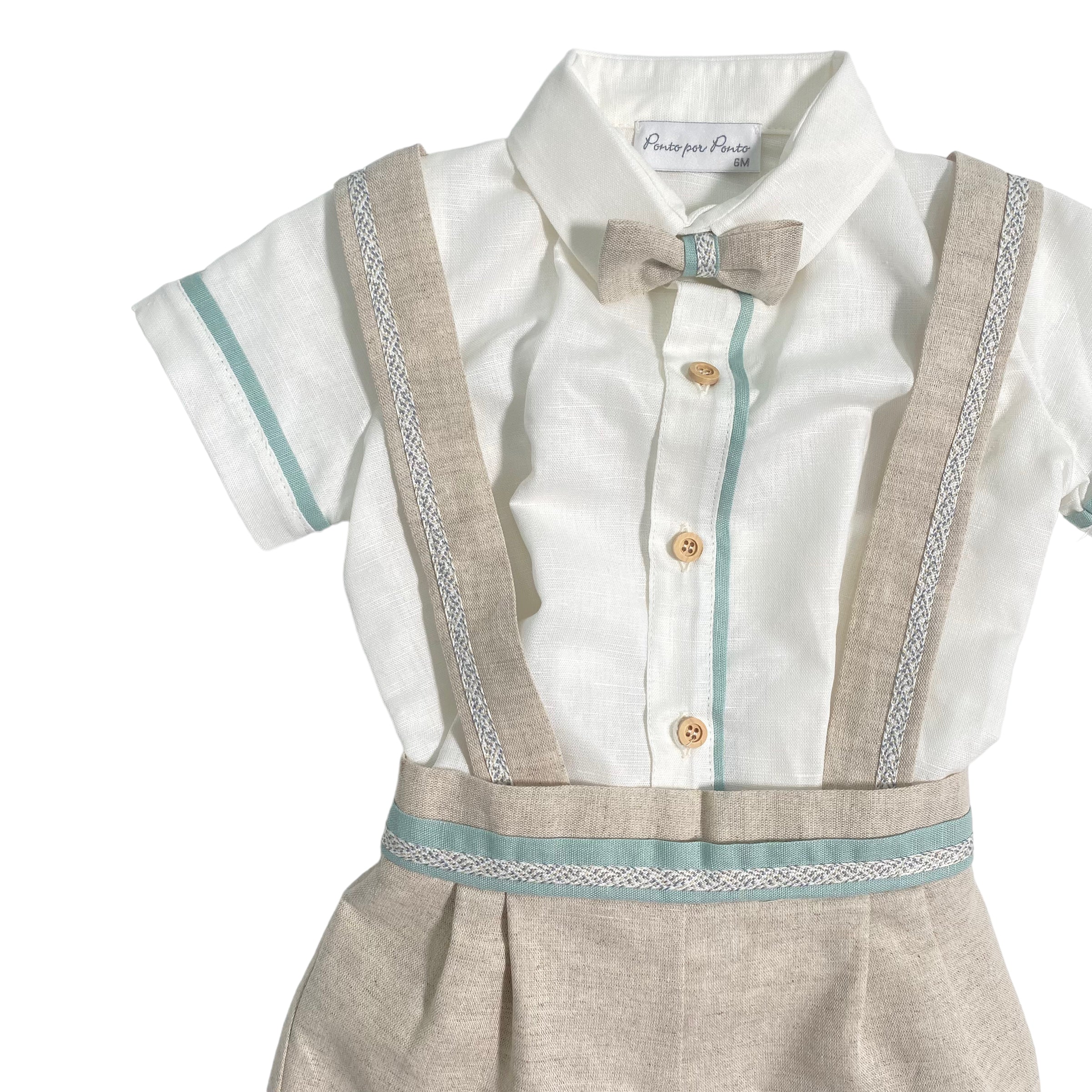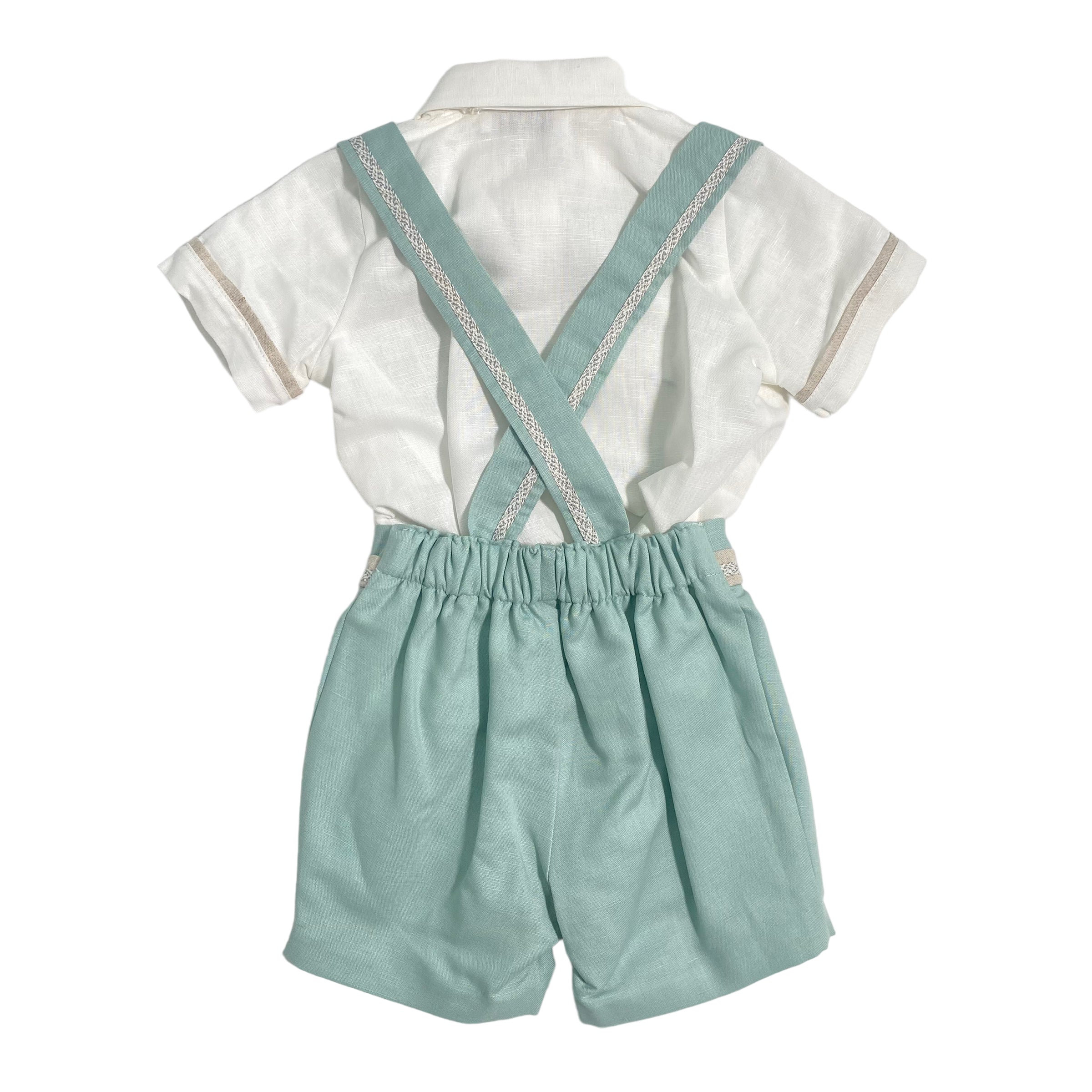 - bermuda in tinta unita, con applicazione di lino bicolor sulla cintura e bretelle;