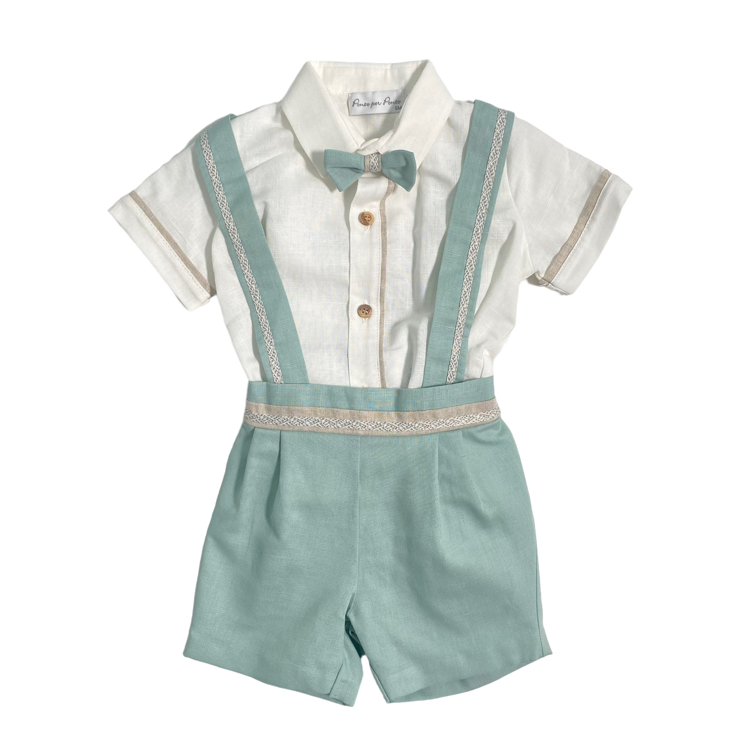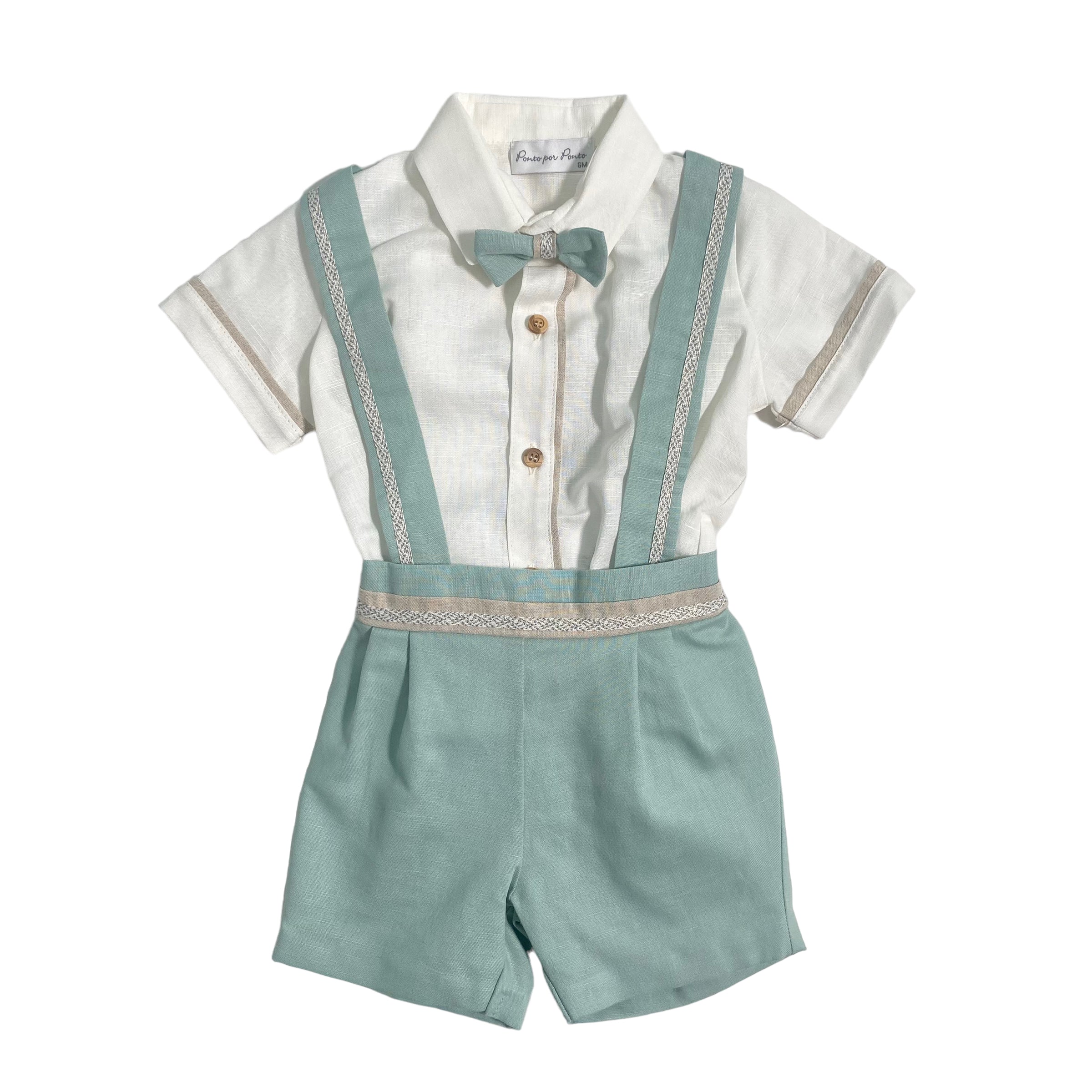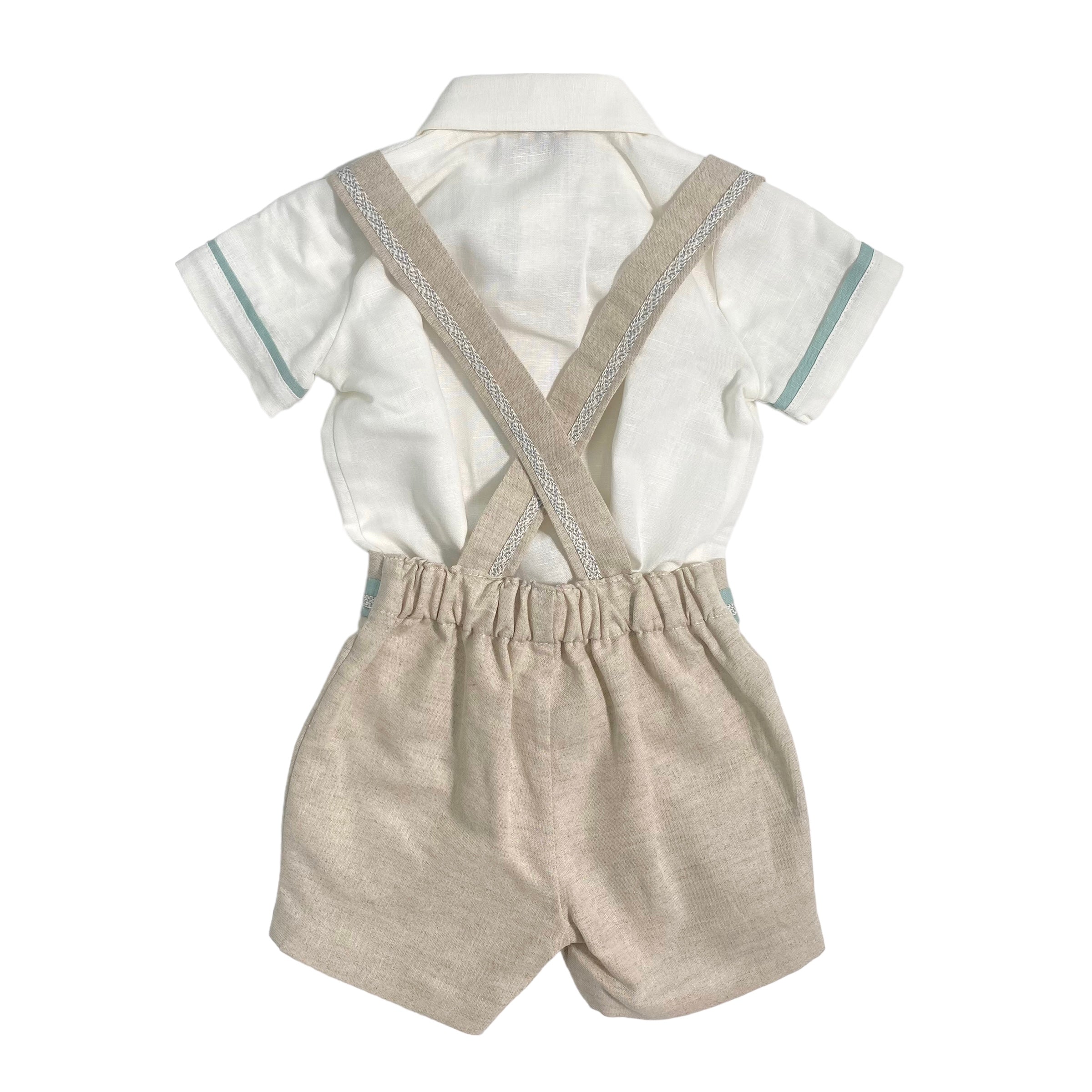 - bermuda in tinta unita, con applicazione di lino bicolor sulla cintura e bretelle;