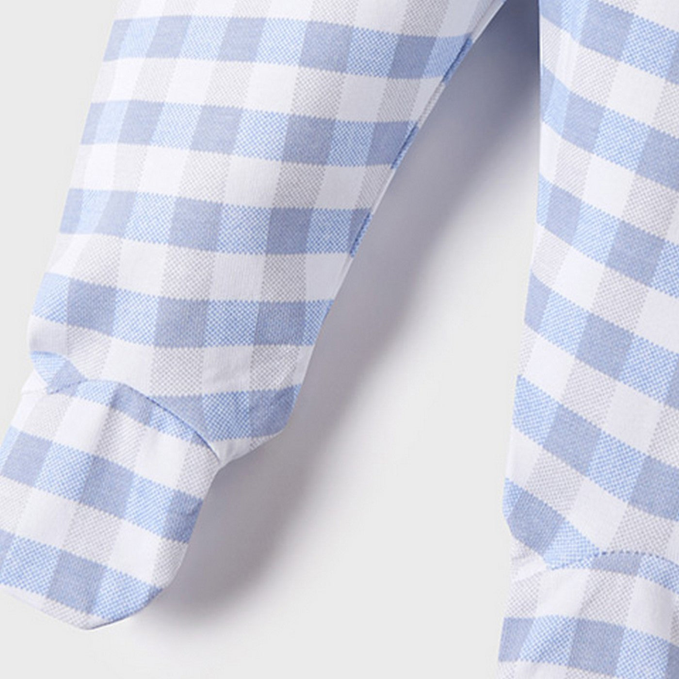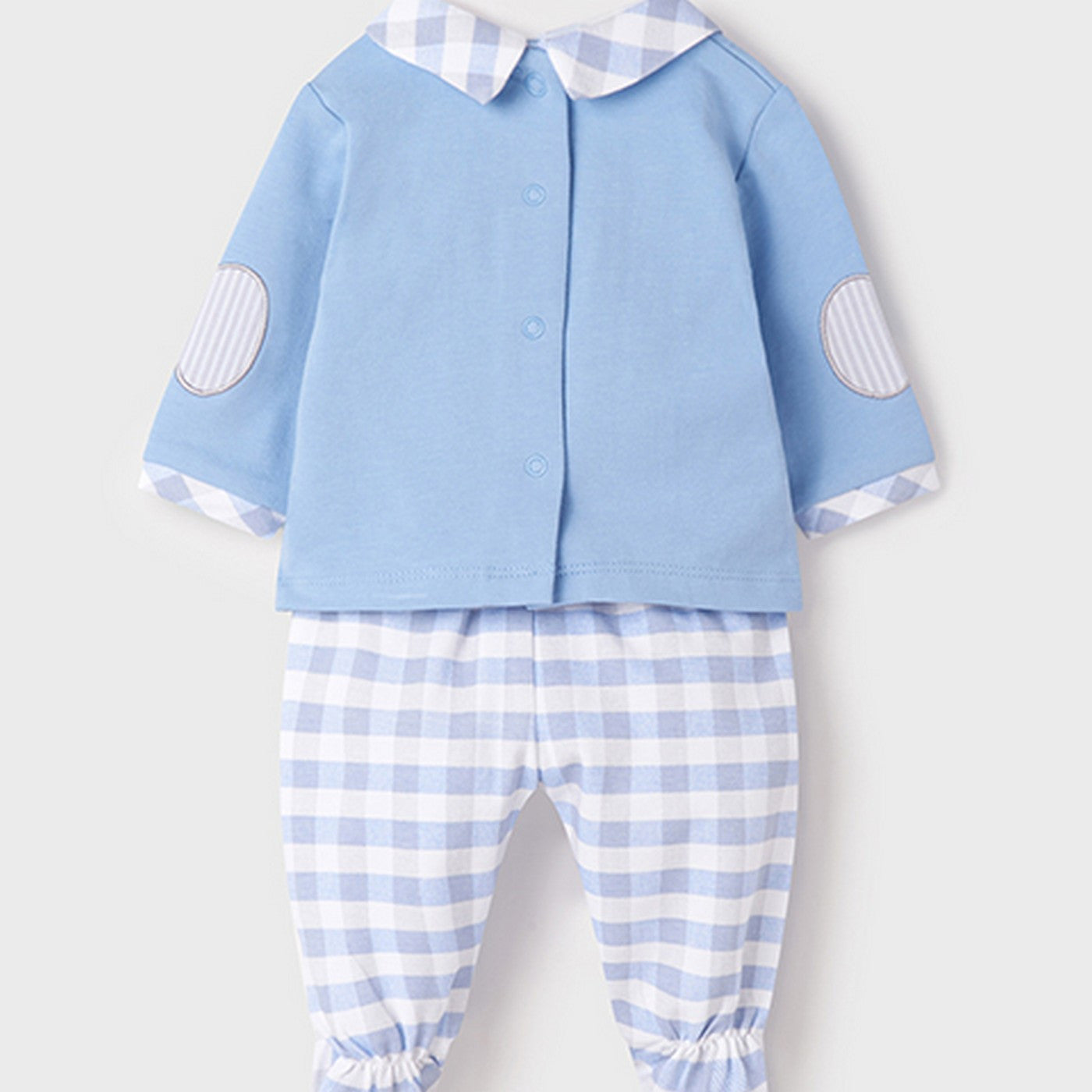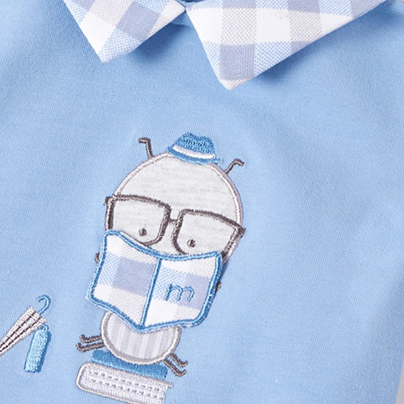 ECOFRIENDS garment 100% organic cotton. Long sleeved t-shirt for newborn. Polo collar with contrasting details. Closure with snap buttons in the back that facilitate the fit of the garment. Comfortable stitch fabric. Decorative elements: decorative applications, model with elbow patches