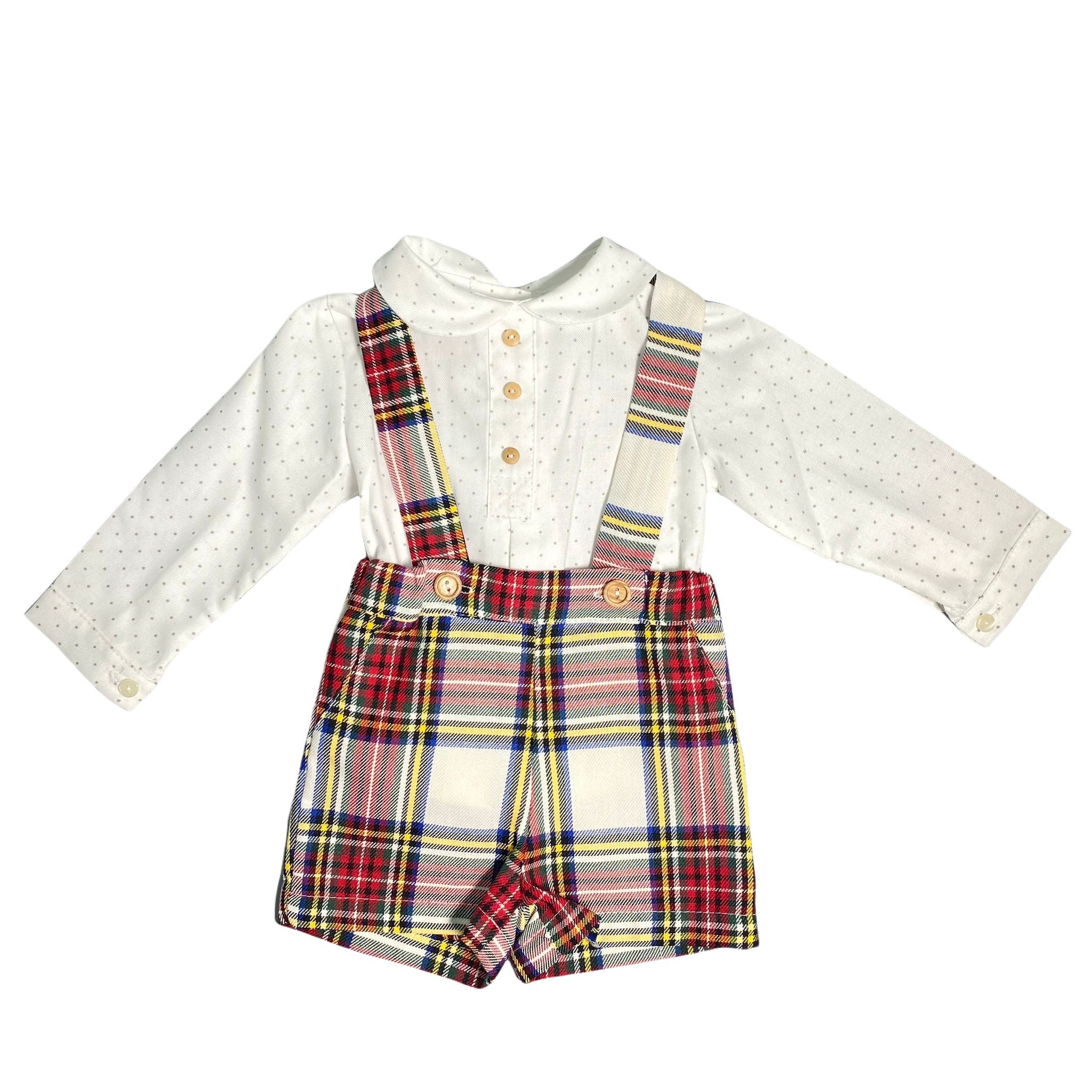 2-piece newborn outfit consisting of: bermuda shorts with tartan patterned suspenders and shirt with round neck with poise pattern, super chic look for your little men
