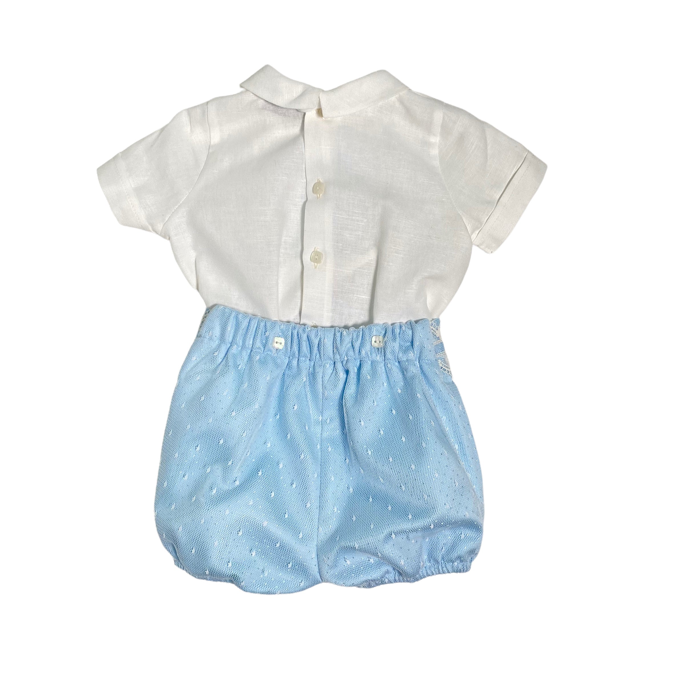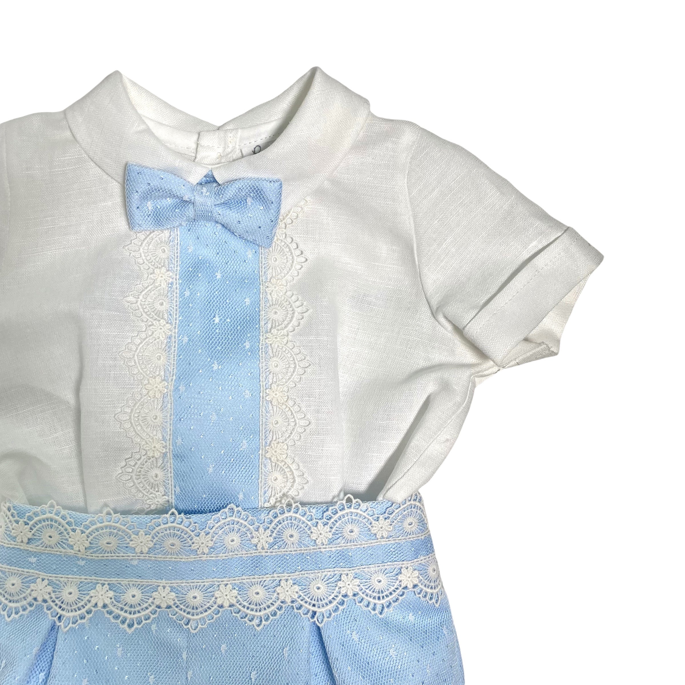 Light blue short shorts with the waist embellished with the same lace processing present on the shirt. The shorts are light blue covered with dotted tulle. The shirt binds with the shorts with internal buttons, to be able to make it an elegant and beautiful romper.