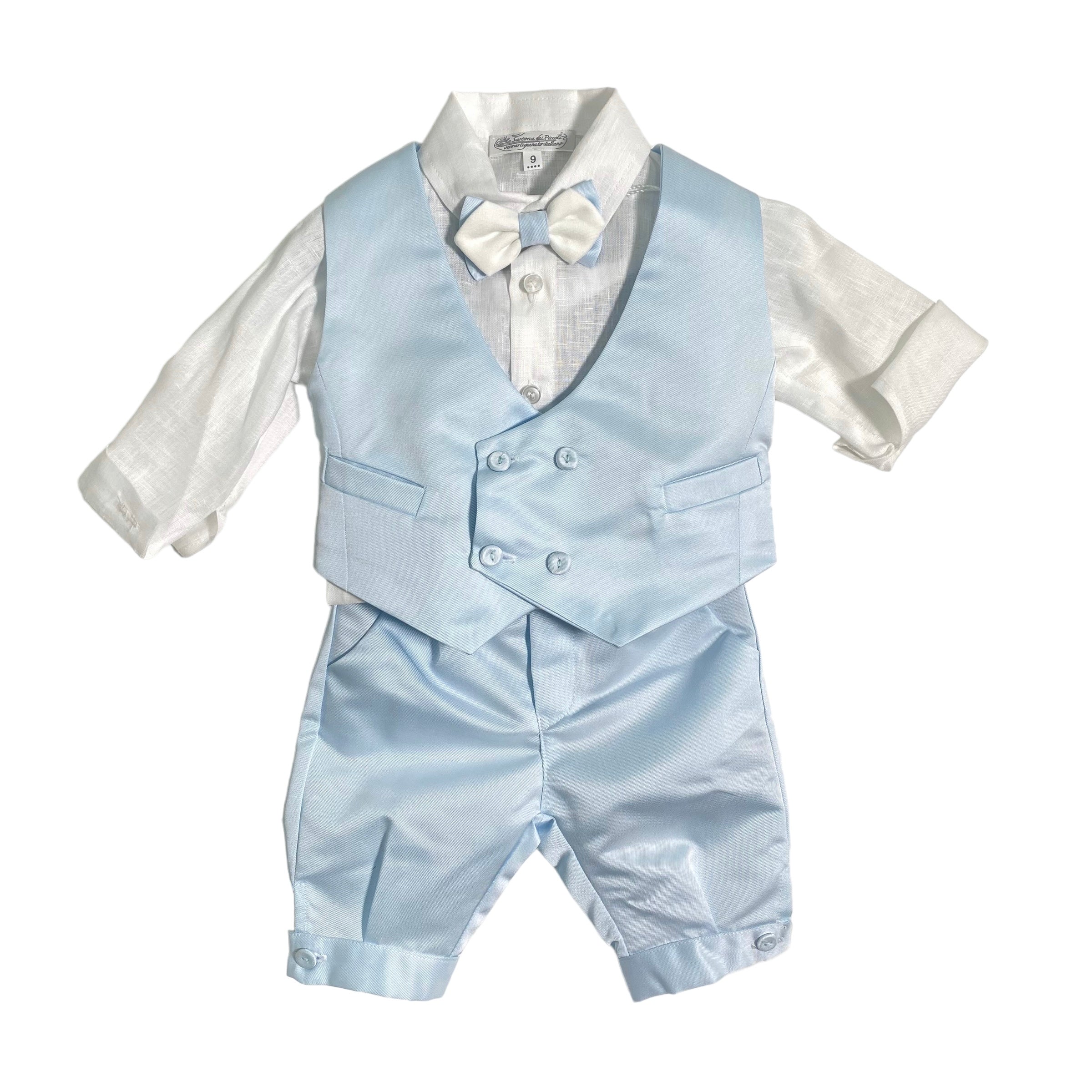 Il Completo Elegante Con Panciotto In Mikado Neonato è il perfetto outfit battesimale per il tuo bambino. Il delicato tessuto in Mikado Azzurro e la camicia bianca in lino con maniche risvoltabili lo rendono elegante e confortevole. Il pantalone a sbuffo e il panciotto doppiopetto lo completano, insieme al papillon doppiato, per uno stile impeccabile.