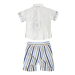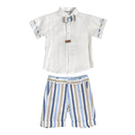 Completo elegante in lino con bermuda a righe e camicia chiusa avanti, con collo coreano, mezza manica, in tinta unita bianca.
