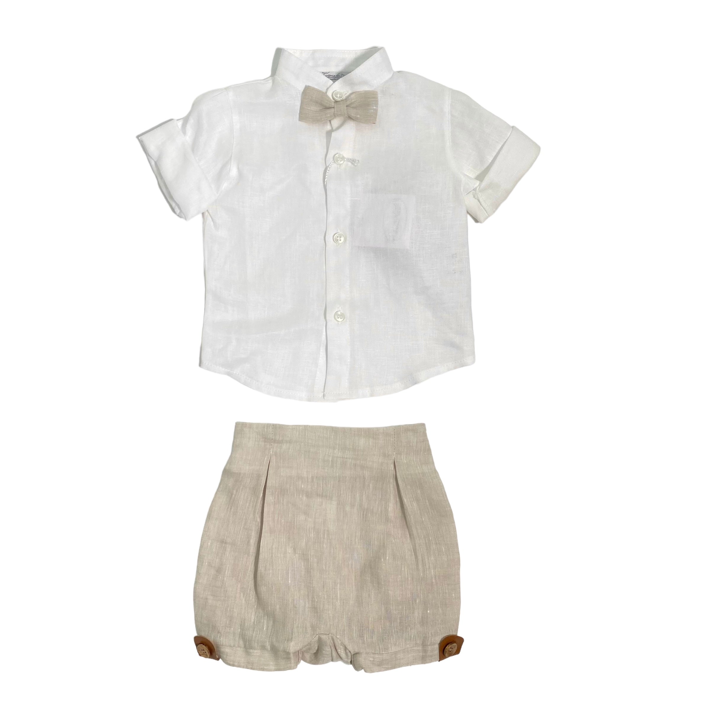 Completo elegante in lino con pantaloncino a sbuffo beige in tinta unita e camicia manica lunga risvoltabile con collo coreano, in tinta unita bianca.